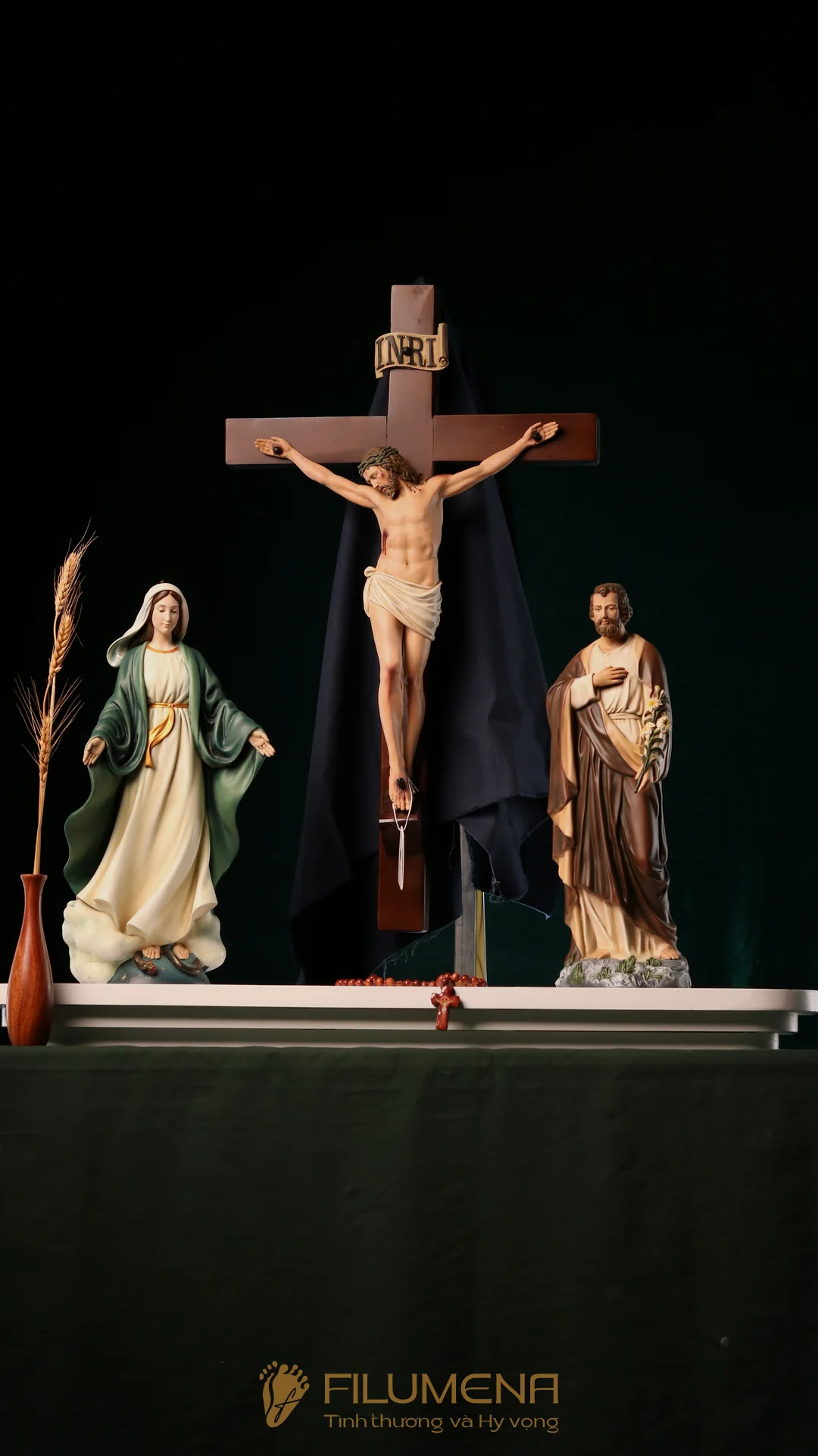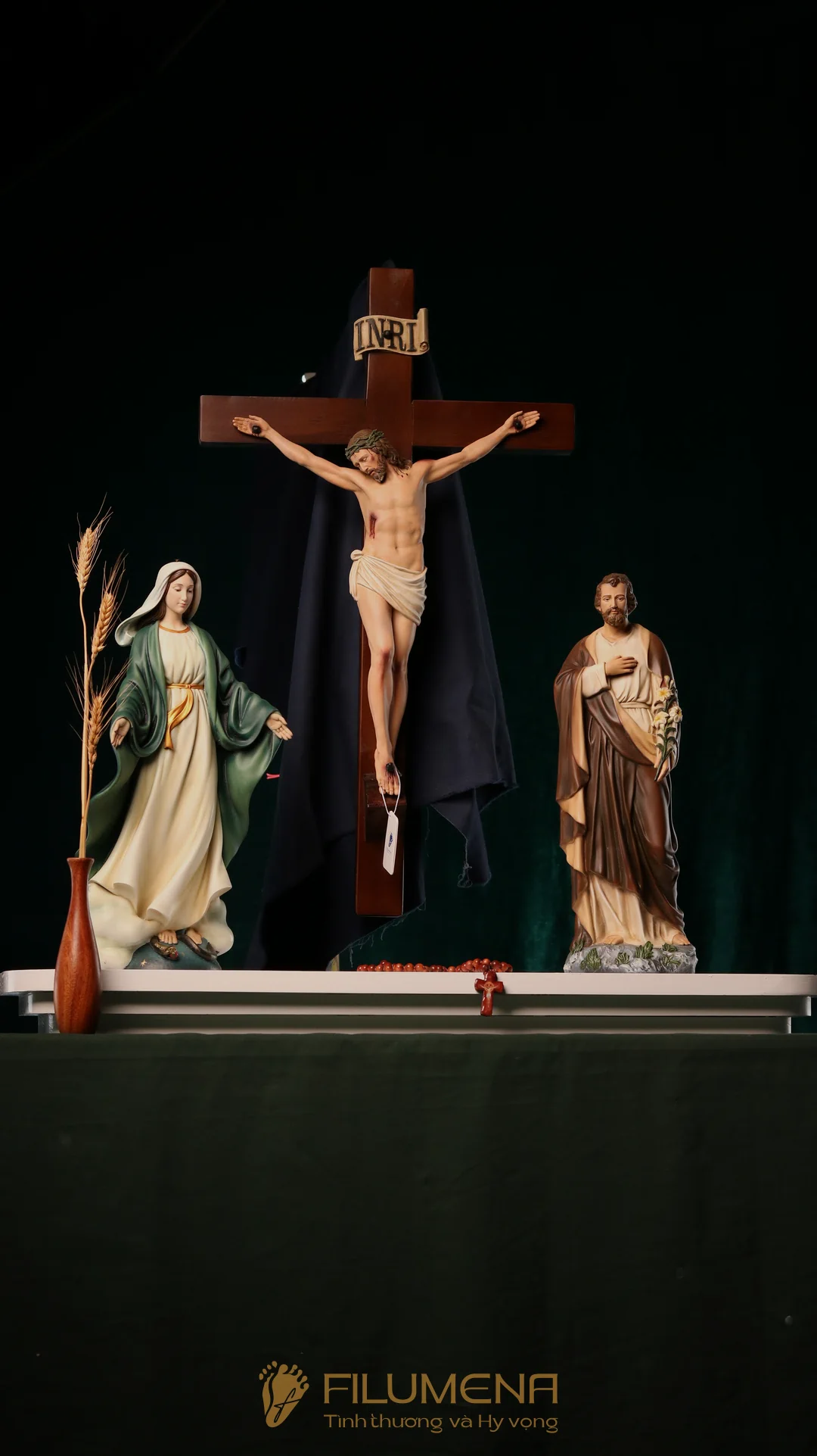 Bàn thờ Chúa là nơi cả gia đình quy tụ cầu nguyện, tạ ơn và trao phó đời sống cho Thiên Chúa. Filumena thiết kế bàn thờ Chúa theo tinh thần trang nghiêm – tối giản, dễ bố trí ở phòng khách hoặc góc cầu nguyện riêng, đồng thời tôn trọng chuẩn phụng vụ: Thánh giá/tượng Chúa ở trung tâm, cân đối với tượng Đức Mẹ và Thánh Giuse, ánh sáng dịu giúp chiêm niệm. Chất liệu chọn lọc, hoàn thiện bền đẹp và tỉ lệ hài hòa với tượng thánh giúp không gian thờ phượng vừa trang trọng, vừa gần gũi—để mỗi ngày, gia đình có một điểm tựa bình an nơi Chúa.