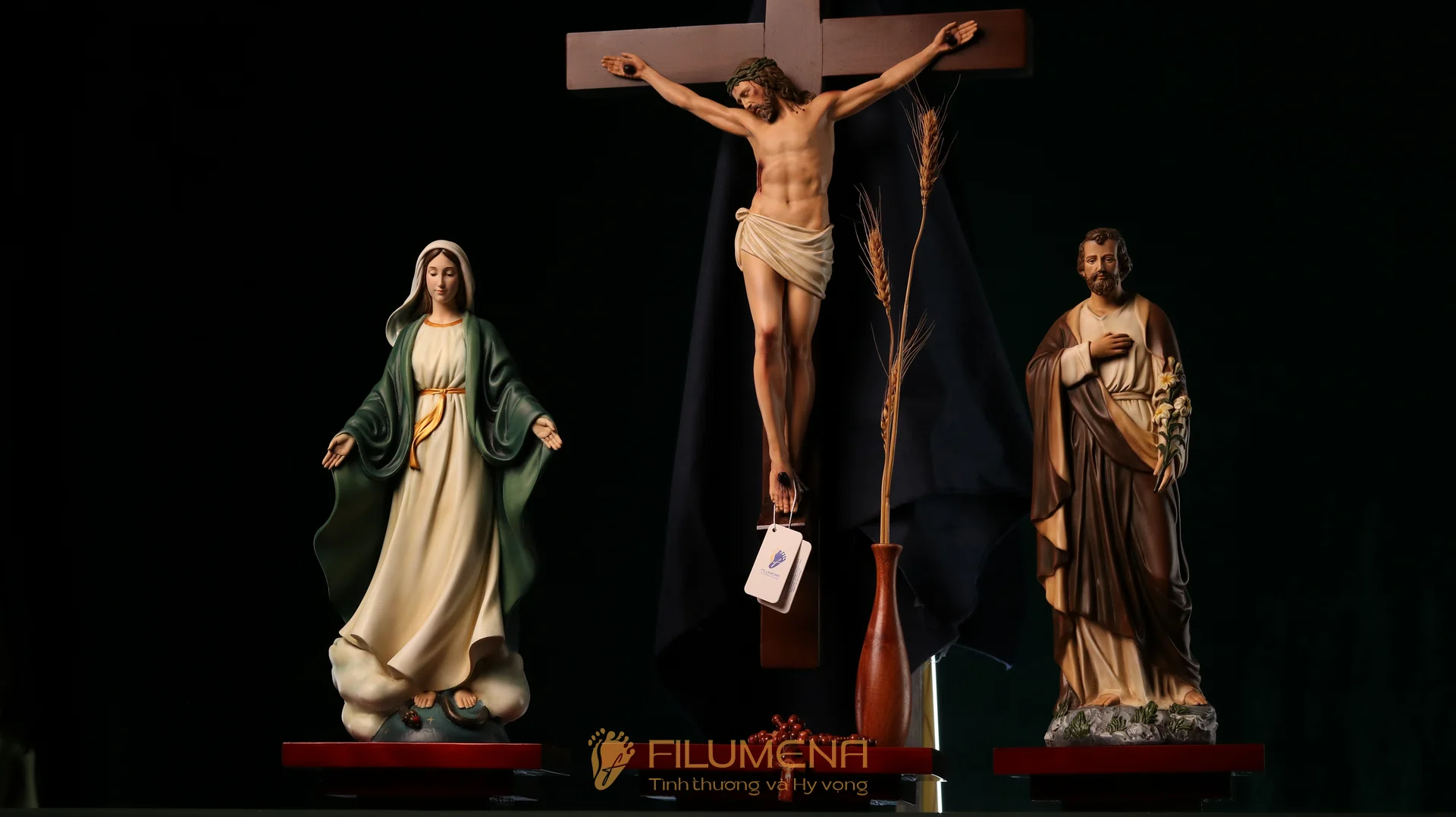 Bộ bàn thờ Chúa bằng gỗ 3 kệ 3 tầng được thiết kế cho bộ 3 tượng Công giáo Filumena. Xin vui lòng xem thêm thông tin về các tác phẩm tượng Công giáo Filumena đi cùng với bàn thờ này.