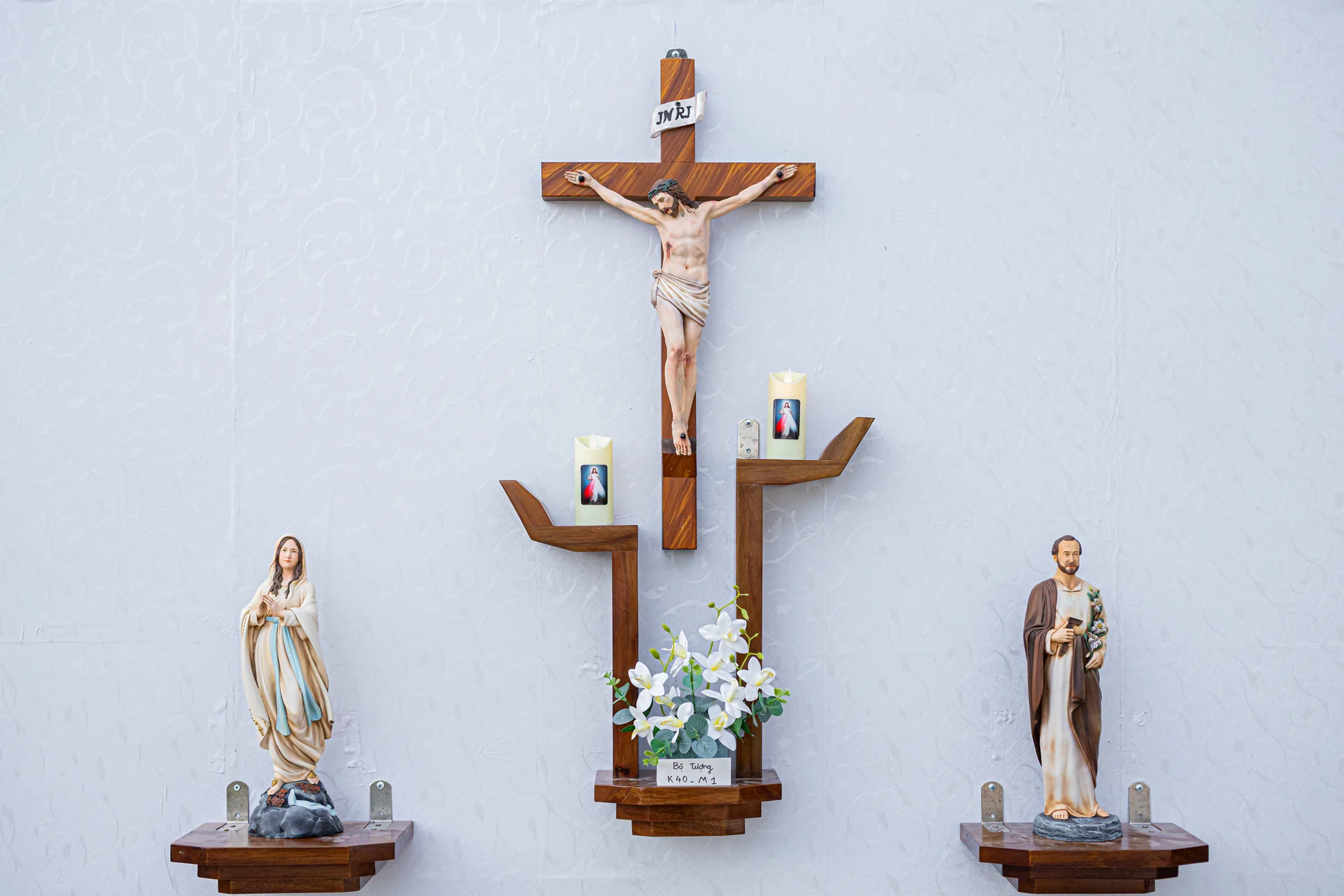 Bàn thờ Chúa BTC1 gồm bộ 3 tượng: tượng Chúa Chịu Nạn với Thánh giá gỗ, tượng Đức Mẹ Lộ Đức và tượng Thánh Giu-se thợ.