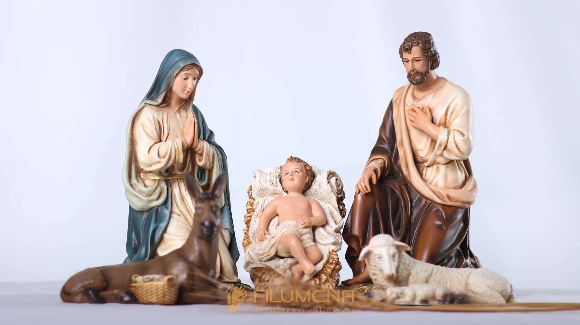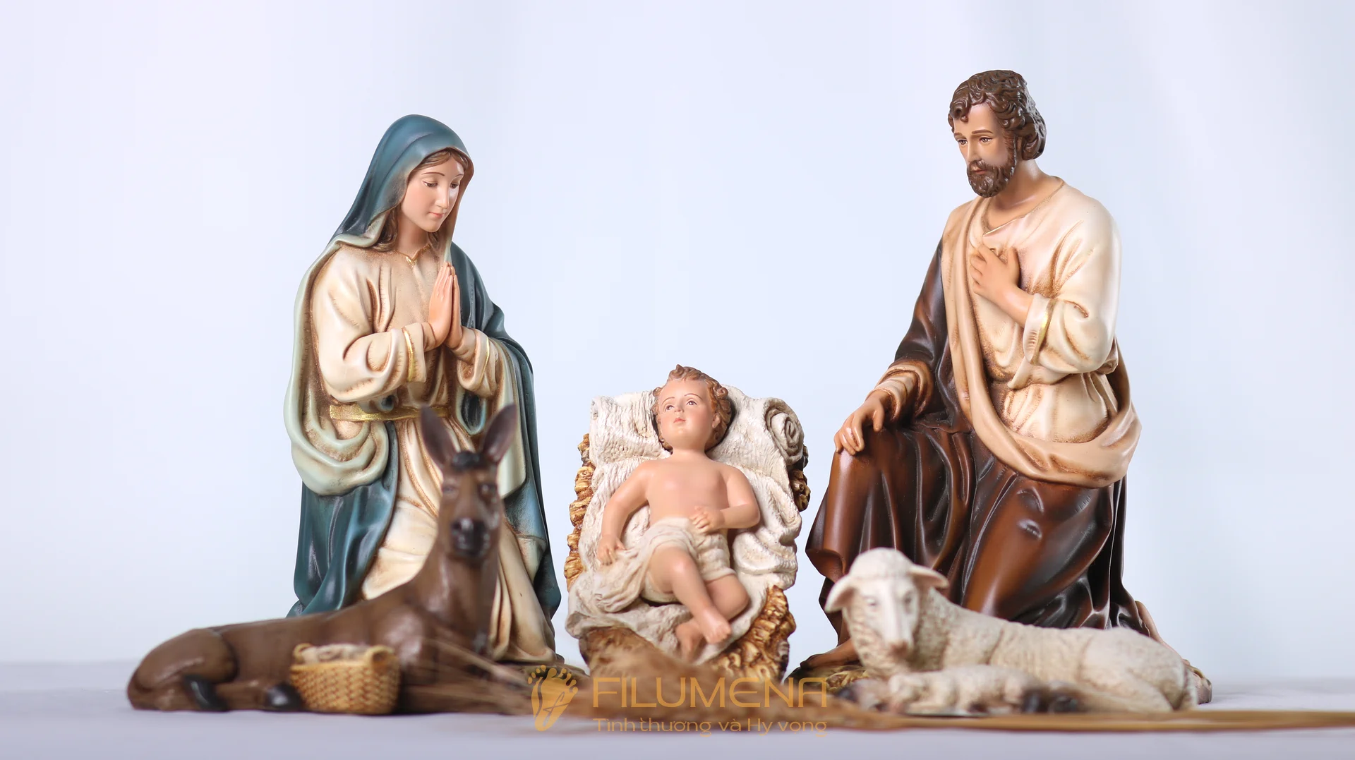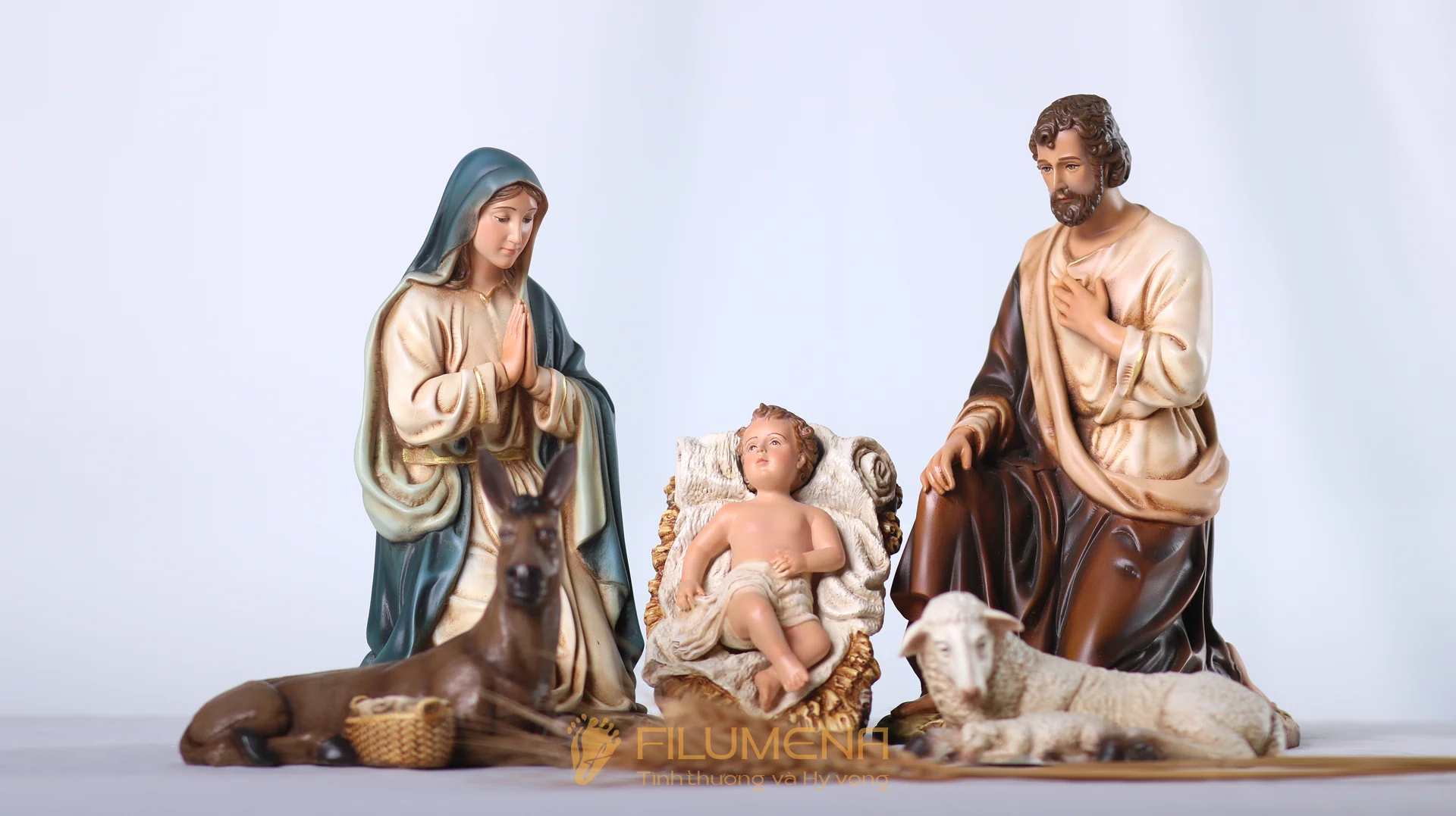 Bộ tượng Giáng Sinh 20 cm 5 nhân vật gồm: Chúa Hài Đồng, Đức Mẹ, Thánh Giuse (quỳ), chiênlừa. Bố cục trung tâm tôn vinh mầu nhiệm Nhập Thể, dễ bày trí tại bàn thờ gia đình, phòng khách hoặc không gian mục vụ nhỏ.