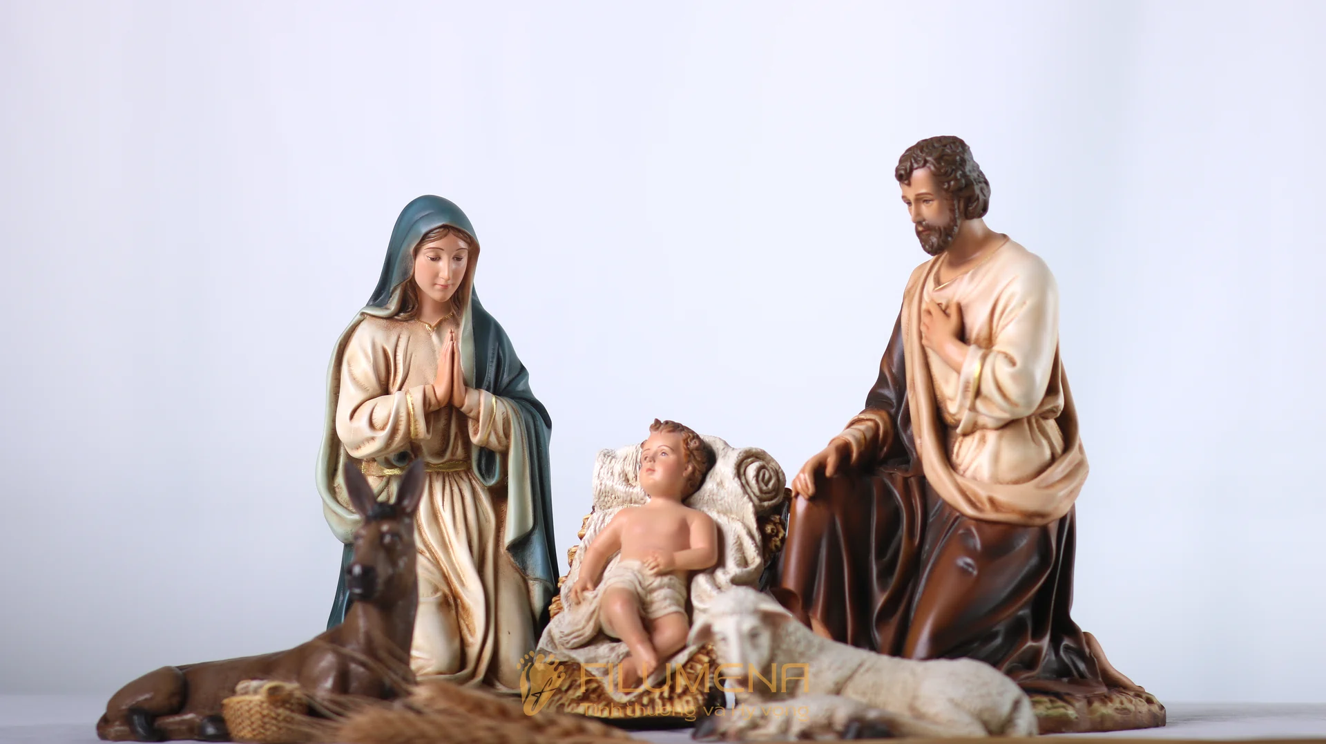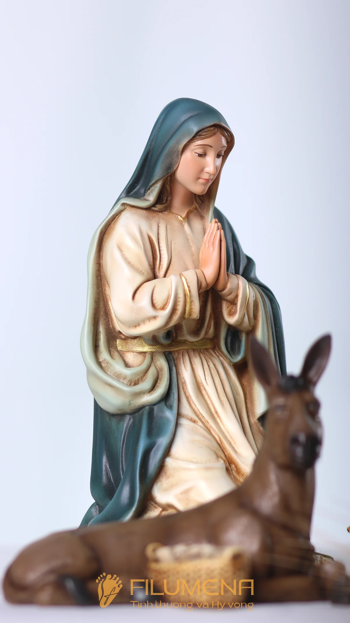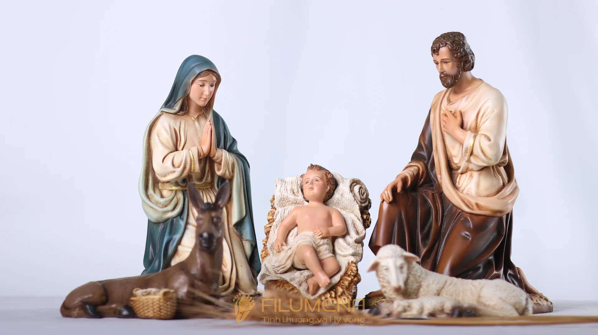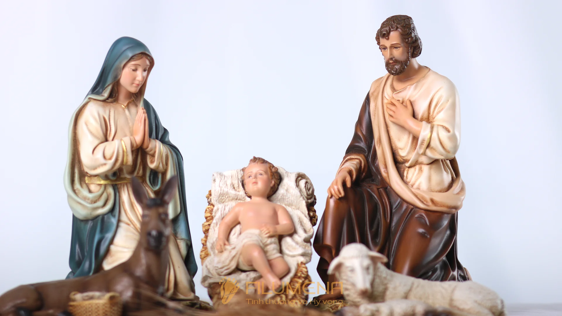 Bộ tượng Giáng Sinh 20 cm 5 nhân vật gồm: Chúa Hài Đồng, Đức Mẹ, Thánh Giuse (quỳ), chiênlừa. Bố cục trung tâm tôn vinh mầu nhiệm Nhập Thể, dễ bày trí tại bàn thờ gia đình, phòng khách hoặc không gian mục vụ nhỏ.