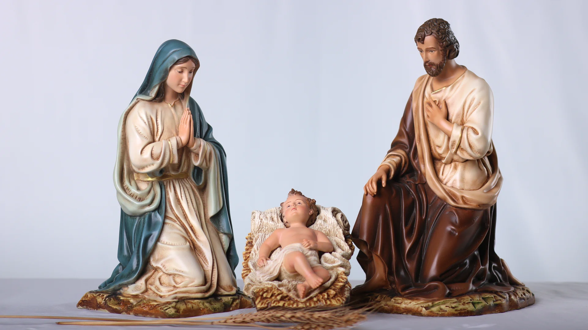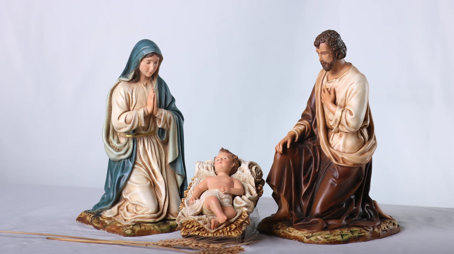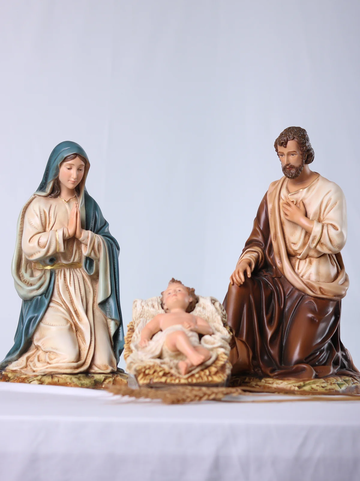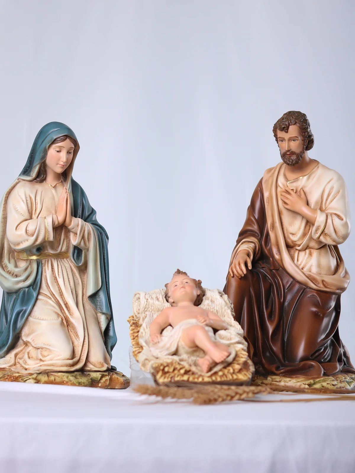 Bộ tượng Giáng Sinh 30 cm – 3 nhân vật gồm Chúa Hài Đồng, Đức Mẹ và Thánh Giuse, được bố cục xoay quanh máng cỏ để tôn vinh trung tâm mầu nhiệm Nhập Thể. Tỉ lệ hài hòa, dáng quỳ khiêm cung giúp bộ tượng dễ bày trí trên bàn thờ gia đình, phòng khách hay các không gian mục vụ nhỏ, tạo nên một góc cầu nguyện ấm áp và trang nhã trong mùa Noel cũng như suốt năm phụng vụ.