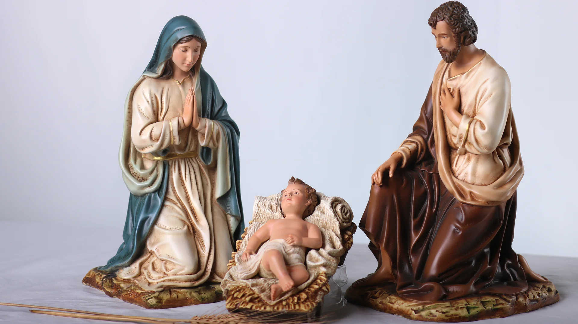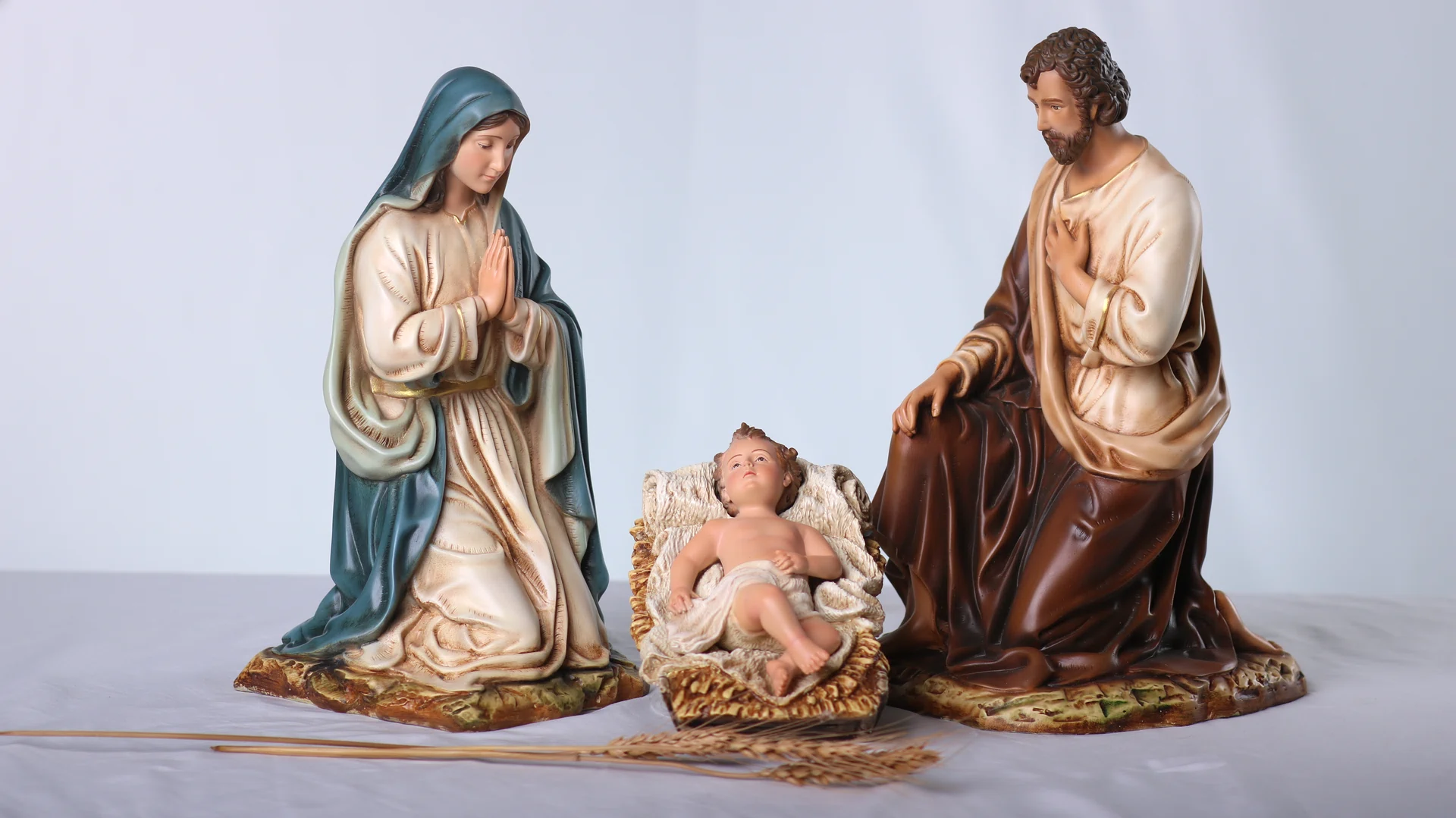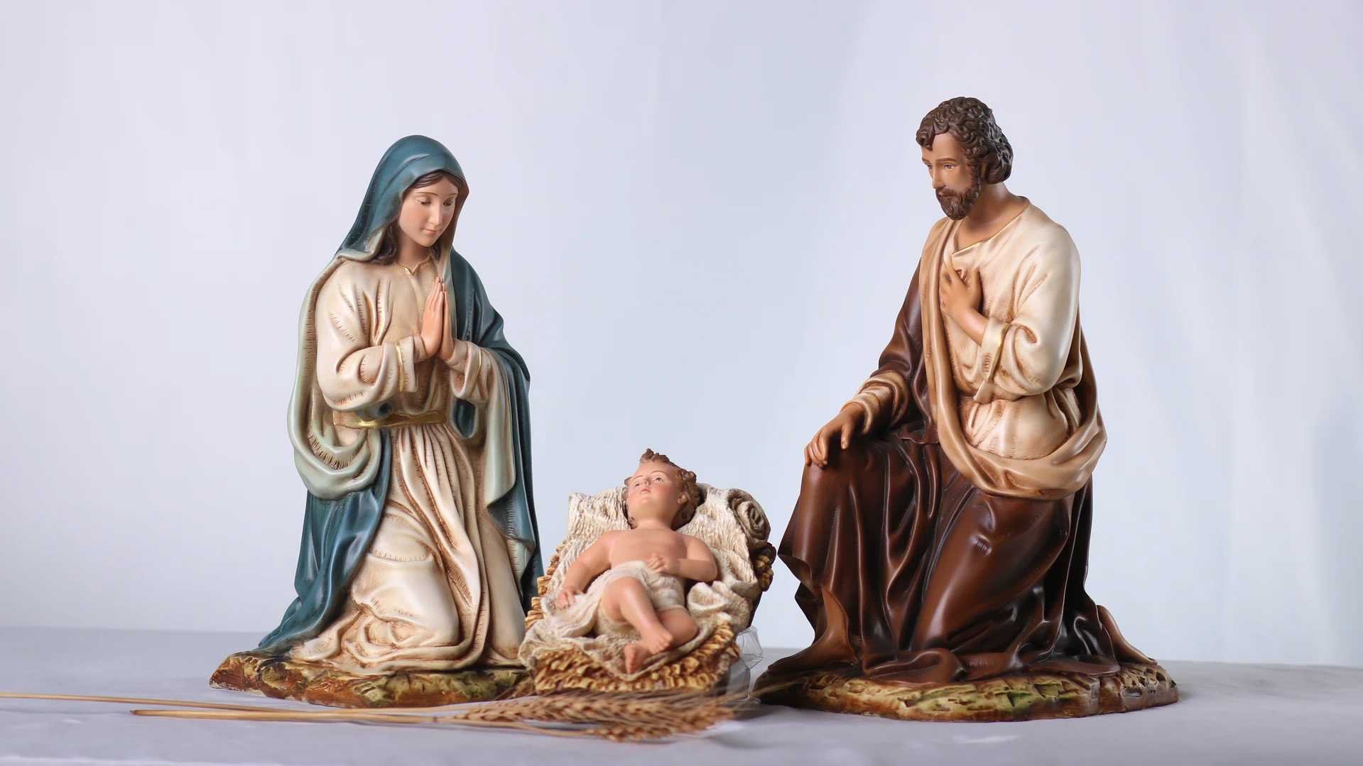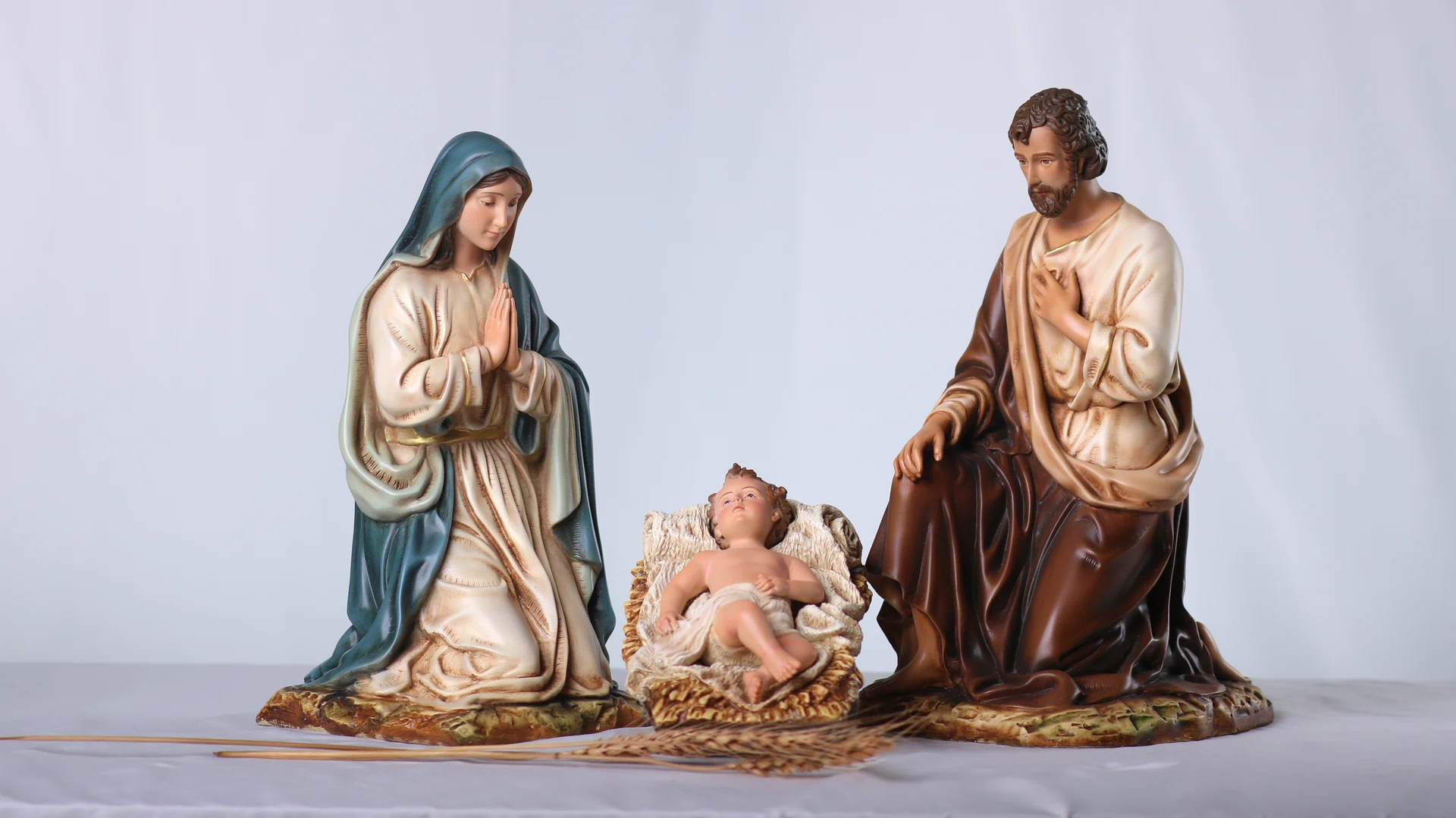 Bộ tượng Giáng Sinh 30 cm – 3 nhân vật gồm Chúa Hài Đồng, Đức Mẹ và Thánh Giuse, được bố cục xoay quanh máng cỏ để tôn vinh trung tâm mầu nhiệm Nhập Thể. Tỉ lệ hài hòa, dáng quỳ khiêm cung giúp bộ tượng dễ bày trí trên bàn thờ gia đình, phòng khách hay các không gian mục vụ nhỏ, tạo nên một góc cầu nguyện ấm áp và trang nhã trong mùa Noel cũng như suốt năm phụng vụ.