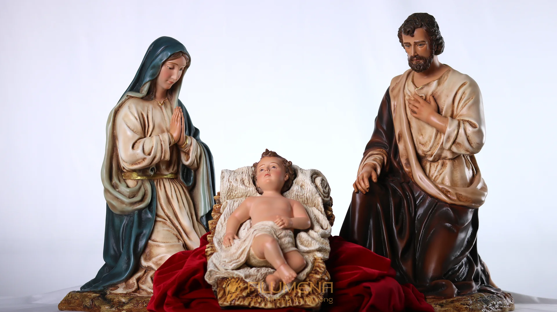 Bộ tượng Giáng Sinh 50 cm (3 nhân vật: Chúa Hài Đồng, Đức Mẹ, Thánh Giuse quỳ), chất liệu bột đá + resin, sơn tay nhiều lớp, bền màu – dễ bày trí bàn thờ gia đình. Có các cỡ 20/30/50 cm. Mỗi tác phẩm đóng góp cho hoạt động bác ái cùng Quỹ Filumena Tình Thương Và Hy Vọng. (C) Filumena Art 2025.