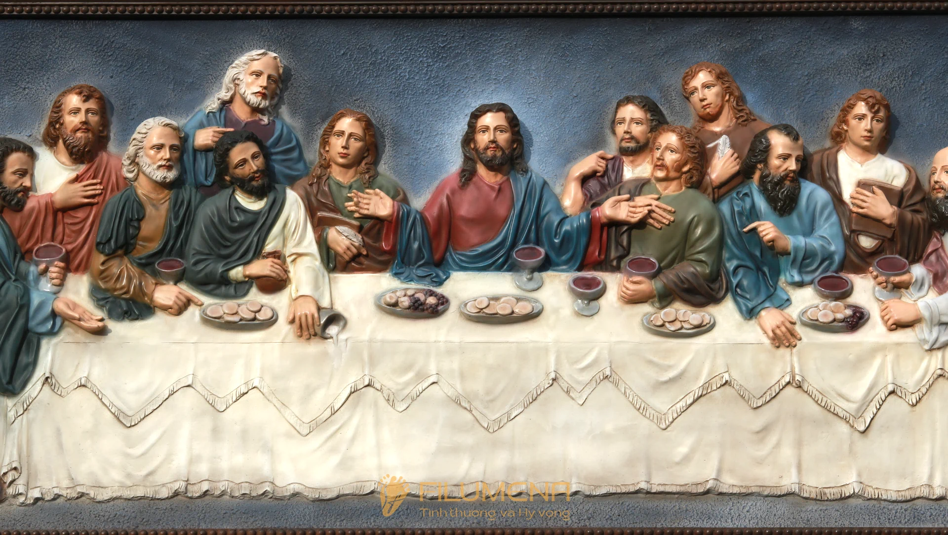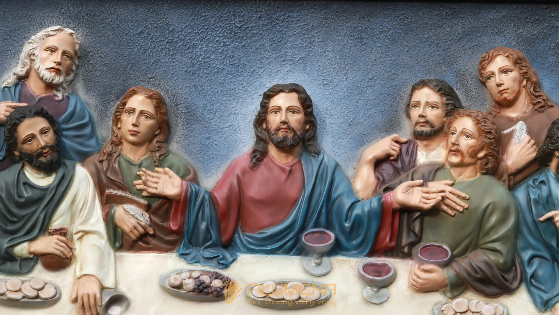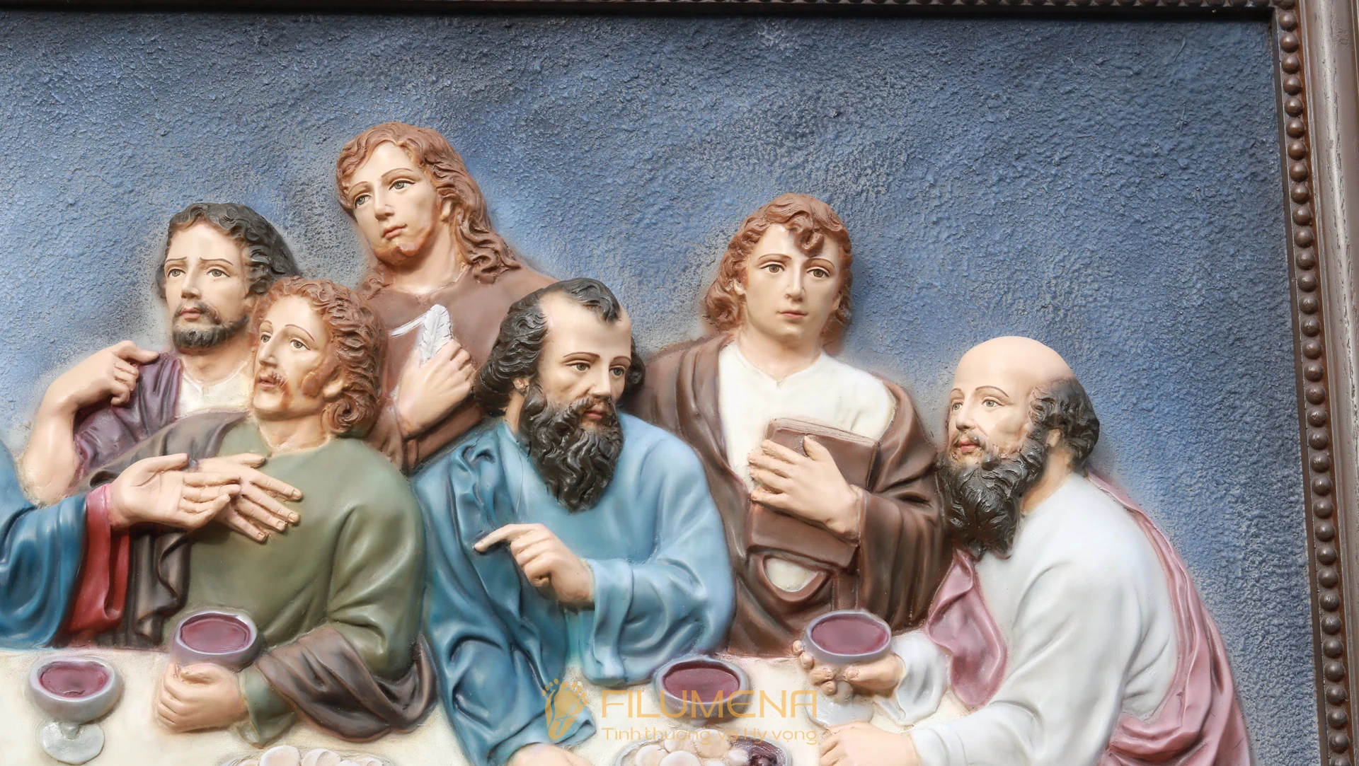 Bàn tiệc được thể hiện với khăn trắng, bánh và chén rượu nho rõ ràng, nhắc ta liên tưởng ngay đến bàn thờ và Thánh Lễ ngày nay. Phần nền xanh trầm, kết hợp với màu áo ấm áp của từng Tông đồ, làm nổi bật khuôn mặt và cử chỉ của các nhân vật, đồng thời tăng cảm giác chiều sâu cho phù điêu. Khung viền được xử lý chắc chắn, tinh tế, giúp tác phẩm khi treo trên tường trở thành một “cửa sổ phụng vụ” trong không gian sống.