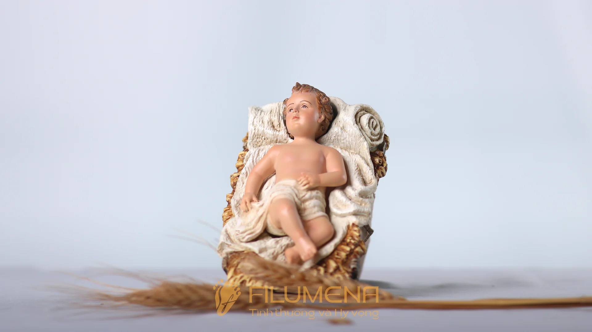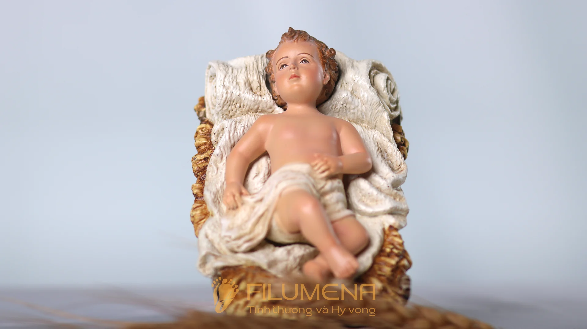 Tượng Chúa Giáng Sinh 10 cm cho bộ tượng Noel 20 cm — Hài Đồng quấn tã, nằm trong máng cỏ; tâm điểm thị giác của bố cục nhỏ gọn. Chất liệu resin + bột đá, sơn tay nhiều lớp; phù hợp bàn thờ gia đình và kệ 60–90 cm.