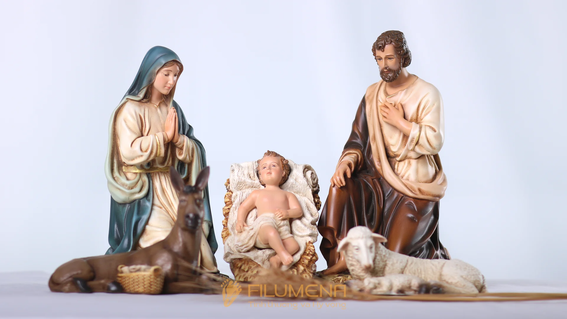 Gợi ý bày trí: Đặt Hài Đồng thấp hơn tầm mắt một chút để tạo cảm giác gần gũi; dùng ánh sáng vàng ấm ở khu vực máng cỏ; chừa khoảng trống để Đức Mẹ và Thánh Giuse tạo thành “mái che” ôm lấy trung tâm.