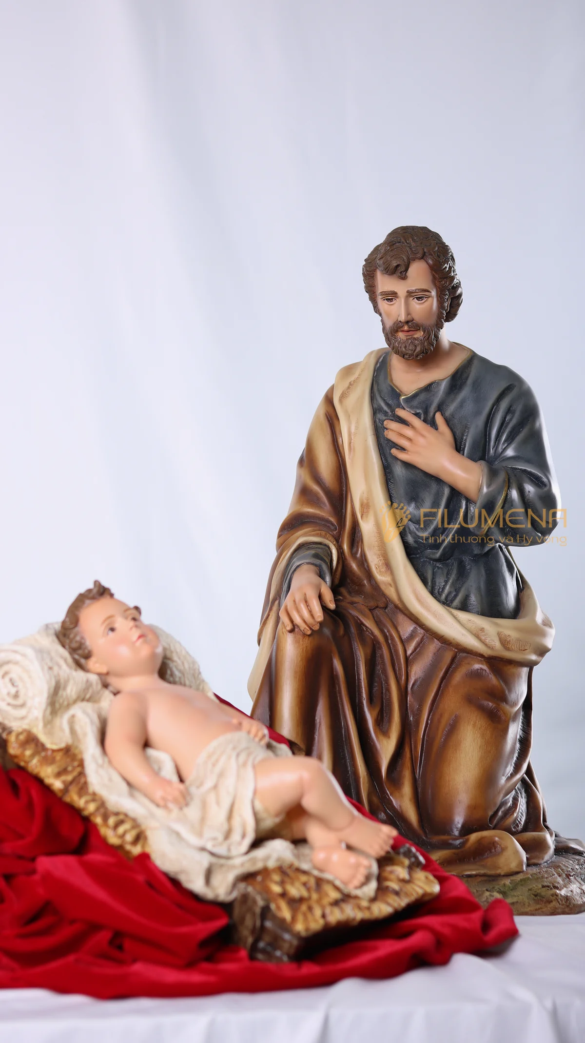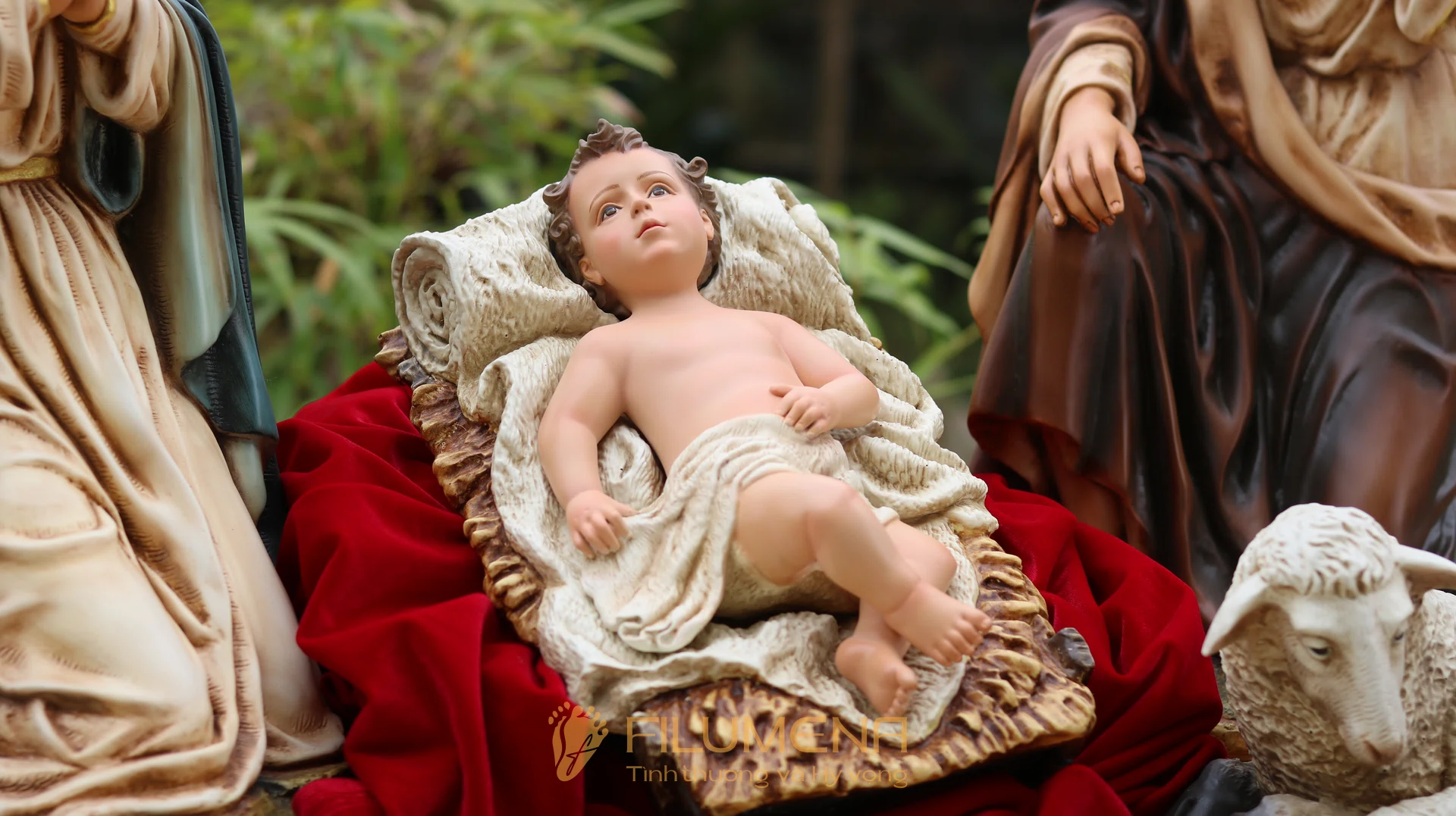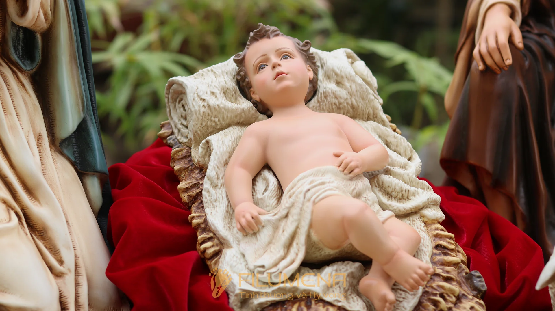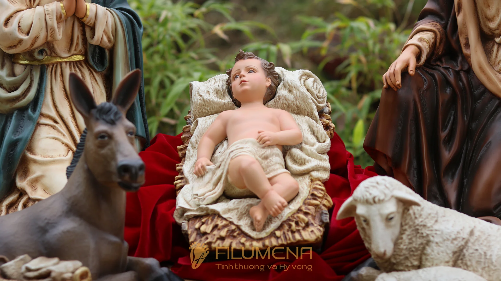 Tượng Chúa Hài Đồng 27 cm cho bộ tượng Giáng Sinh 50 cm được tạo tác với thần thái hiền hòa: Hài Đồng quấn tã, nằm trong máng cỏ, nhấn mạnh trung tâm mầu nhiệm Nhập Thể. Trong bố cục bộ 50 cm, đây là trái tim nơi ánh nhìn tự nhiên quy tụ; Đức Mẹ và Thánh Giuse hình thành “mái che” ôm lấy trung tâm, còn mục đồng/thiên thần/động vật tạo chiều sâu câu chuyện.