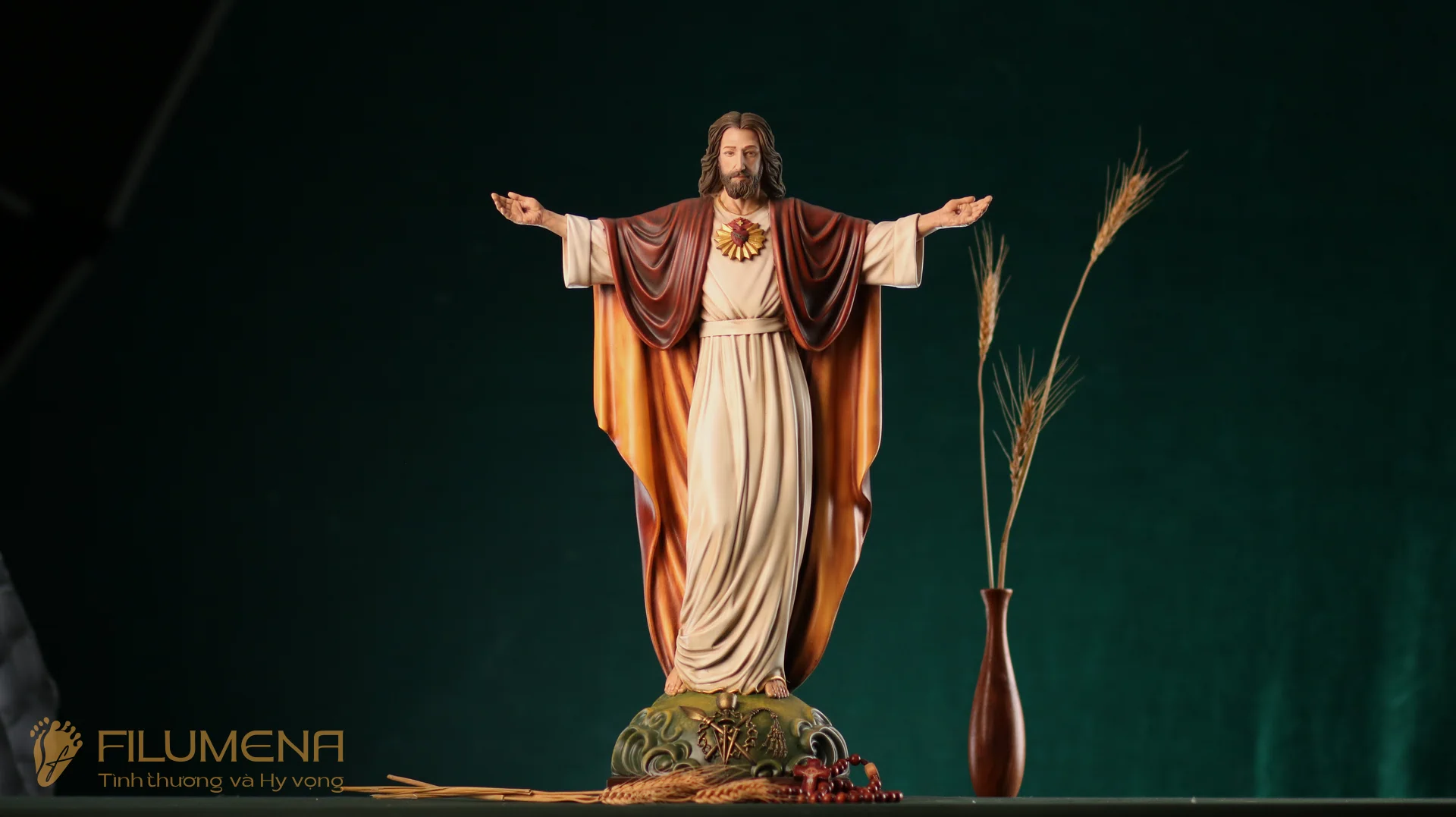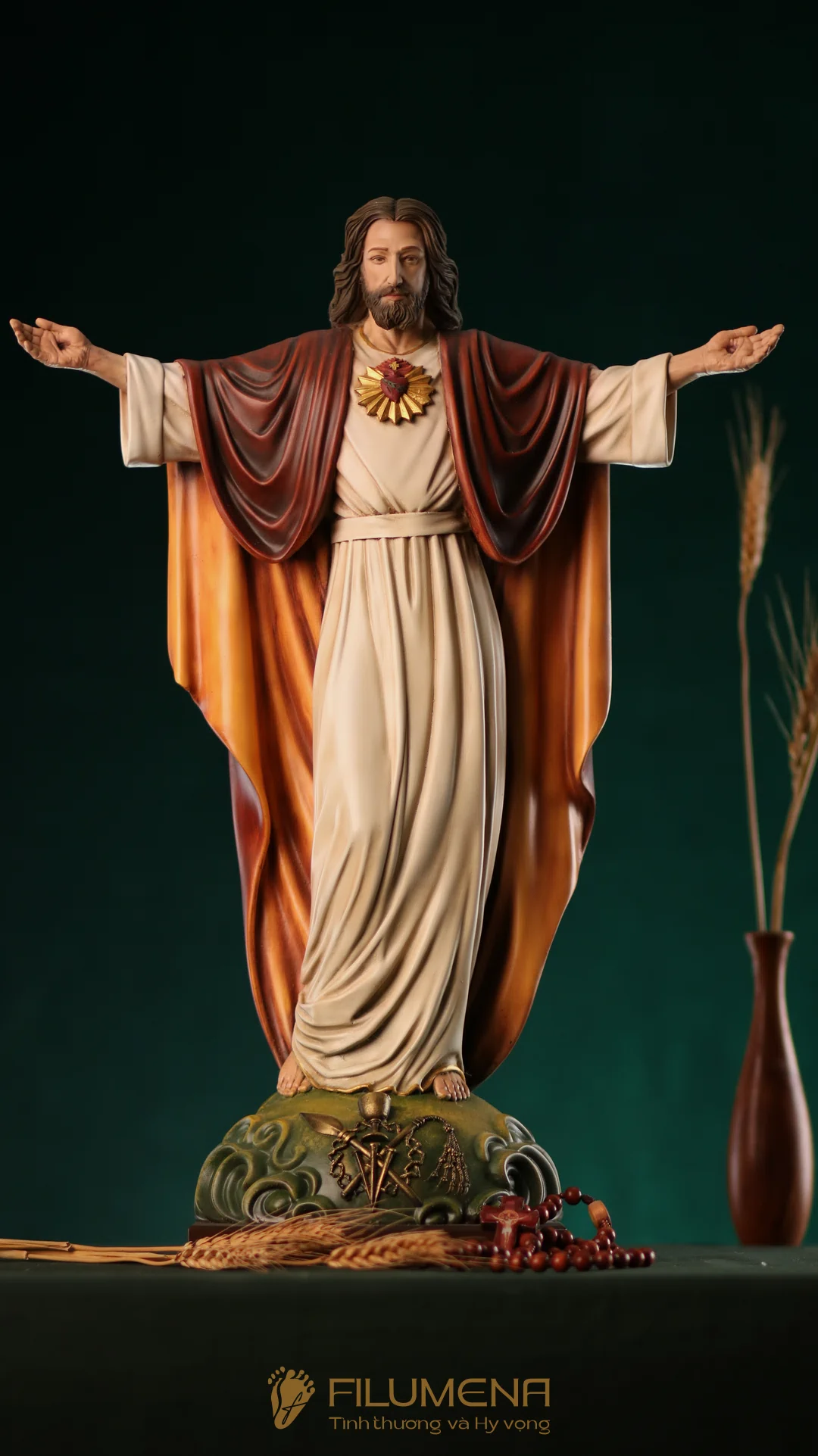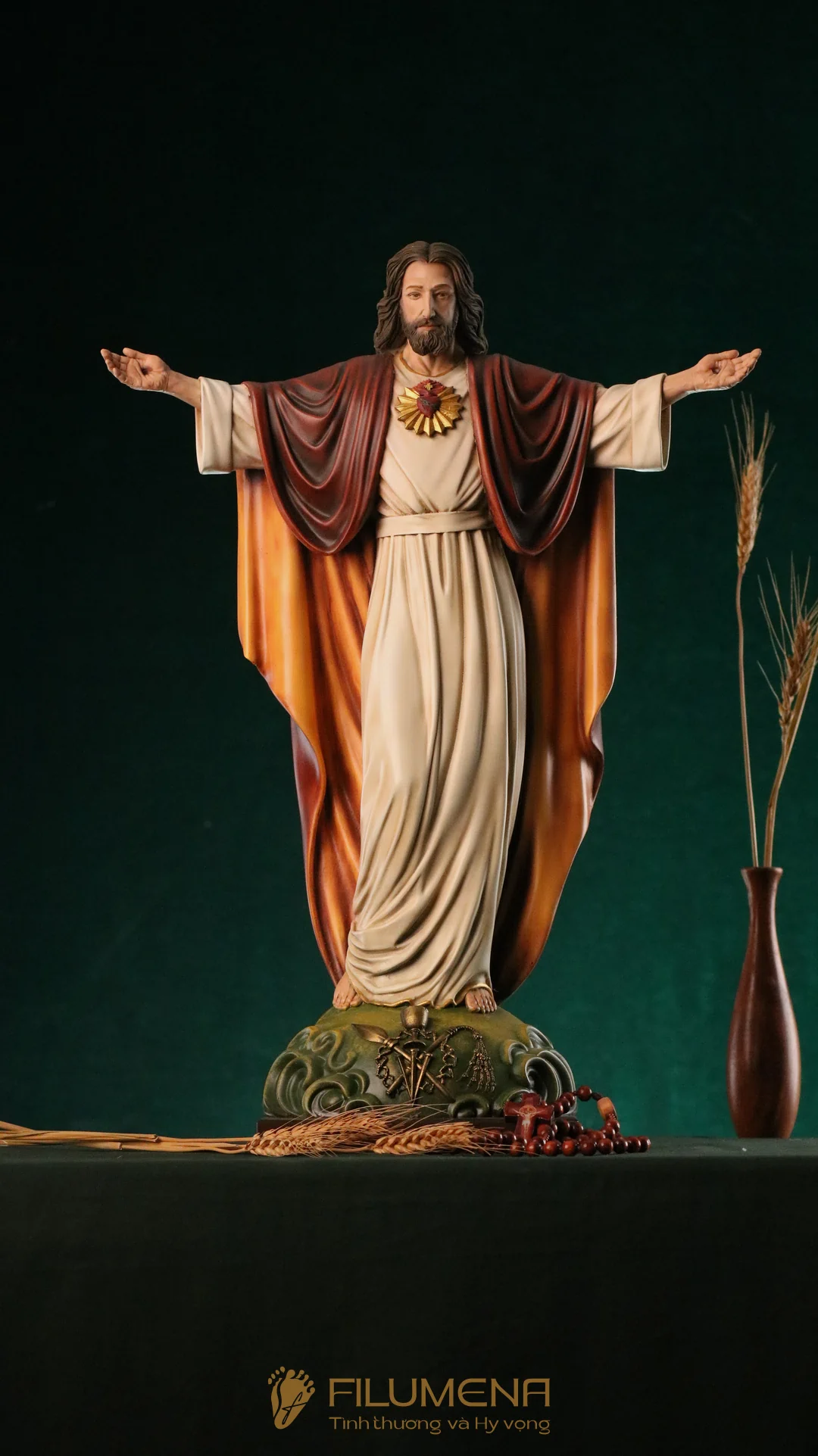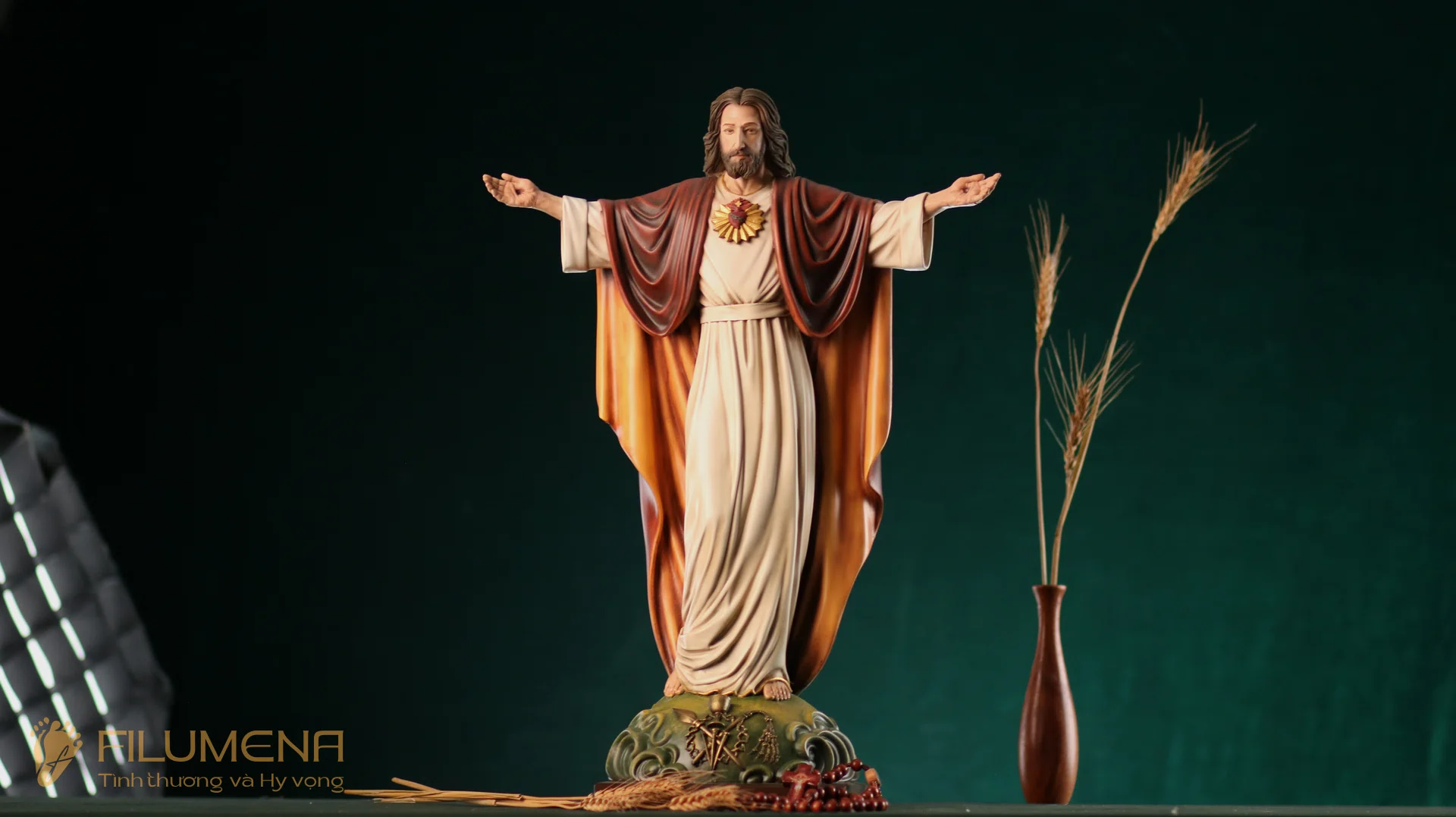 Tượng bằng chất liệu bột đá, cao 50 cm, được vẽ màu thủ công. Có đủ các kích thước 20 cm, 30 cm, 40cm, 50cm. Đây là tác phẩm thuộc bộ 3 tượng cho bàn thờ Công giáo của Filumena.