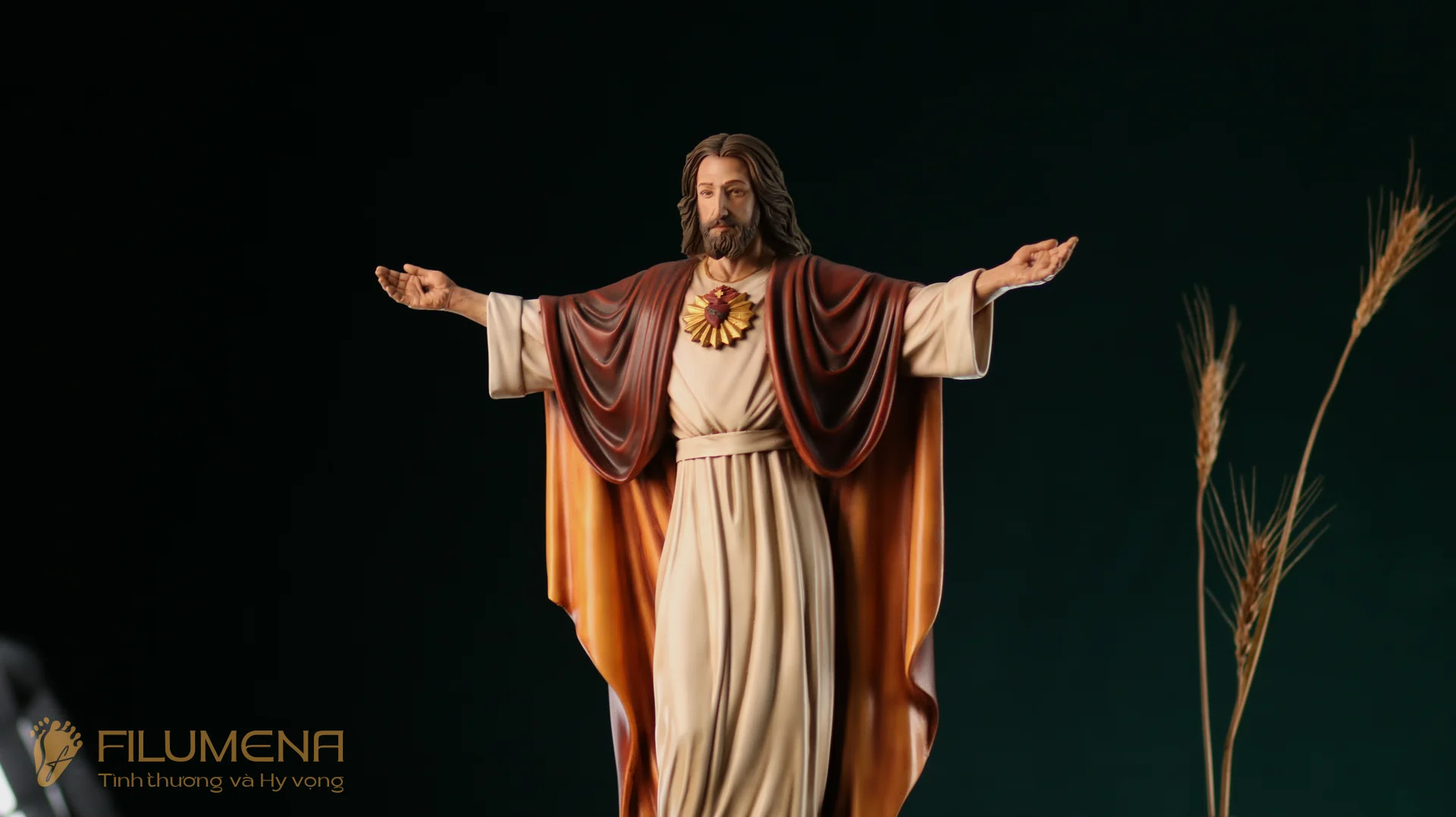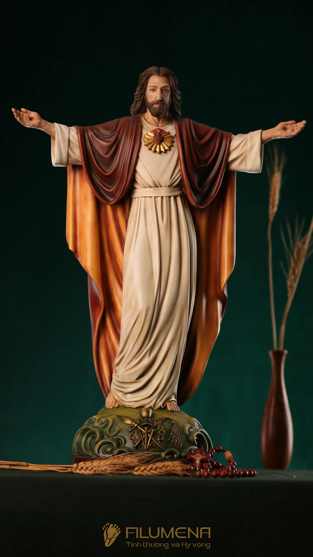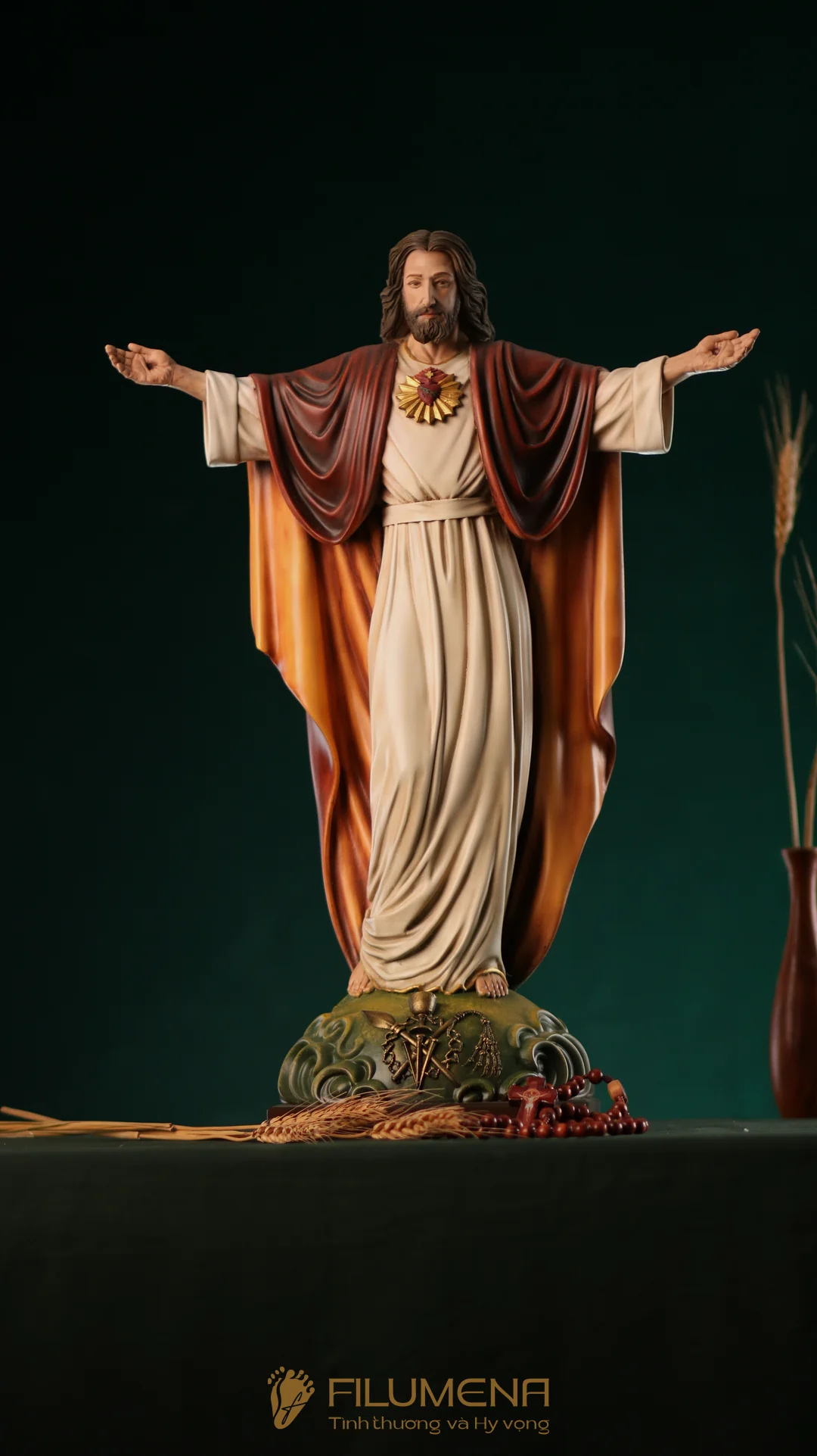 Tượng bằng chất liệu bột đá, cao 50 cm, được vẽ màu thủ công. Có đủ các kích thước 20 cm, 30 cm, 40cm, 50cm. Đây là tác phẩm thuộc bộ 3 tượng cho bàn thờ Công giáo của Filumena.
