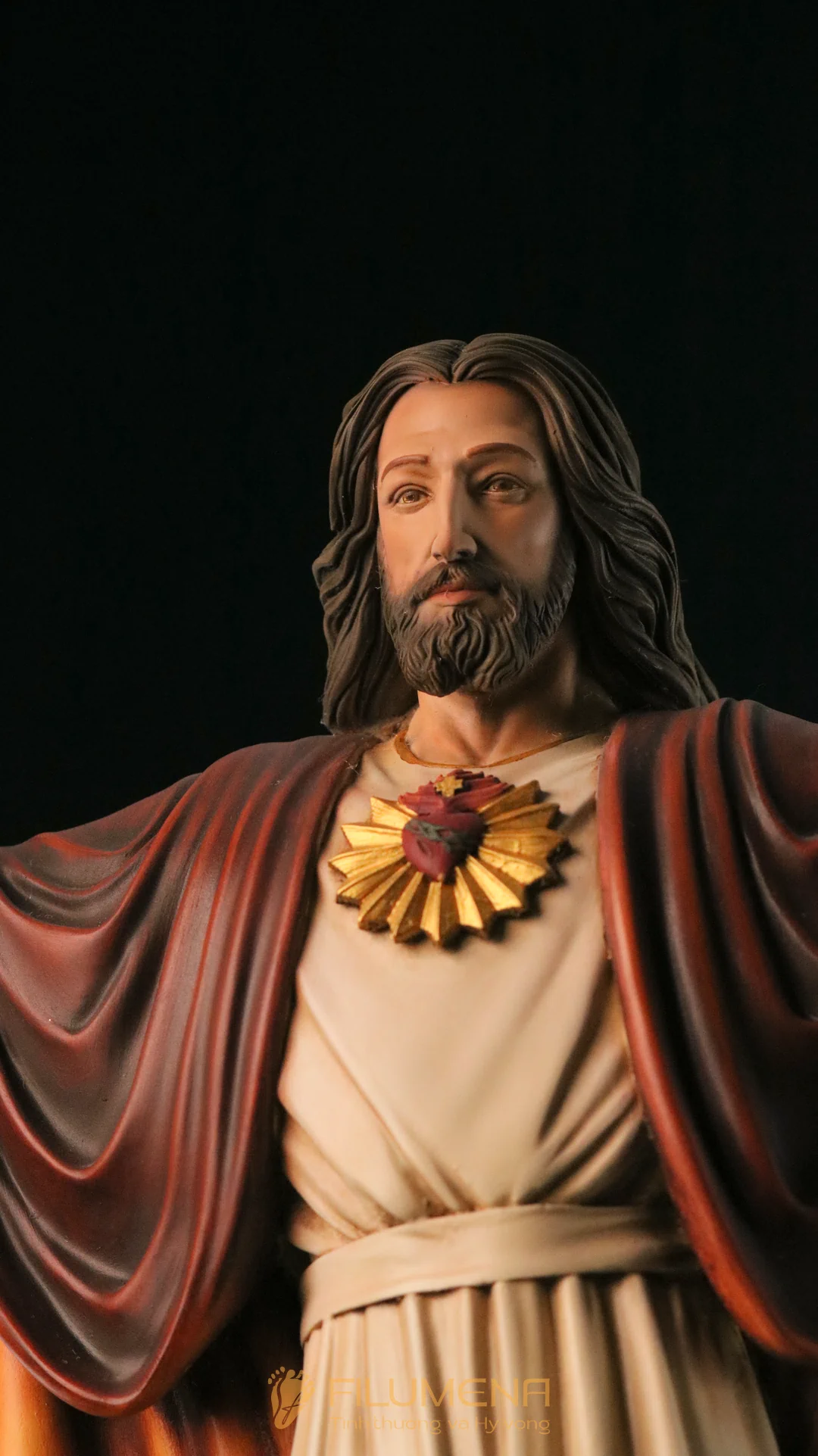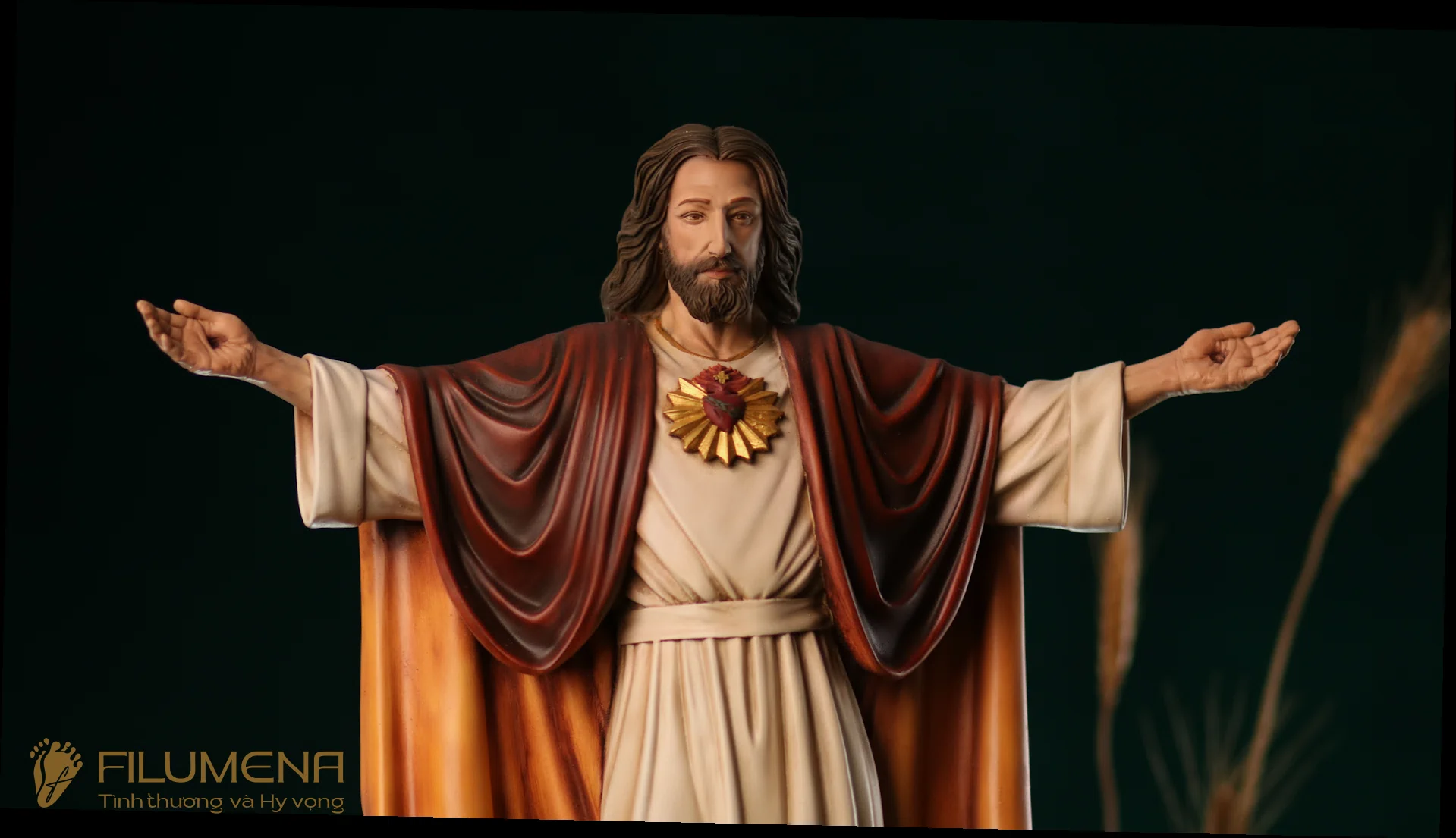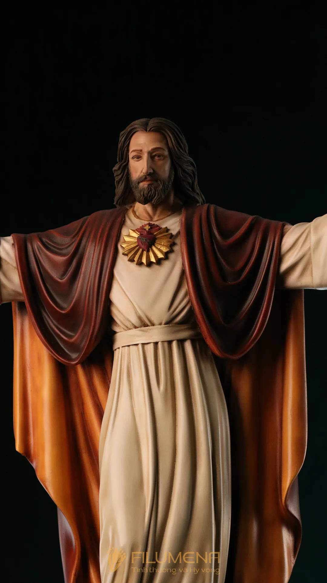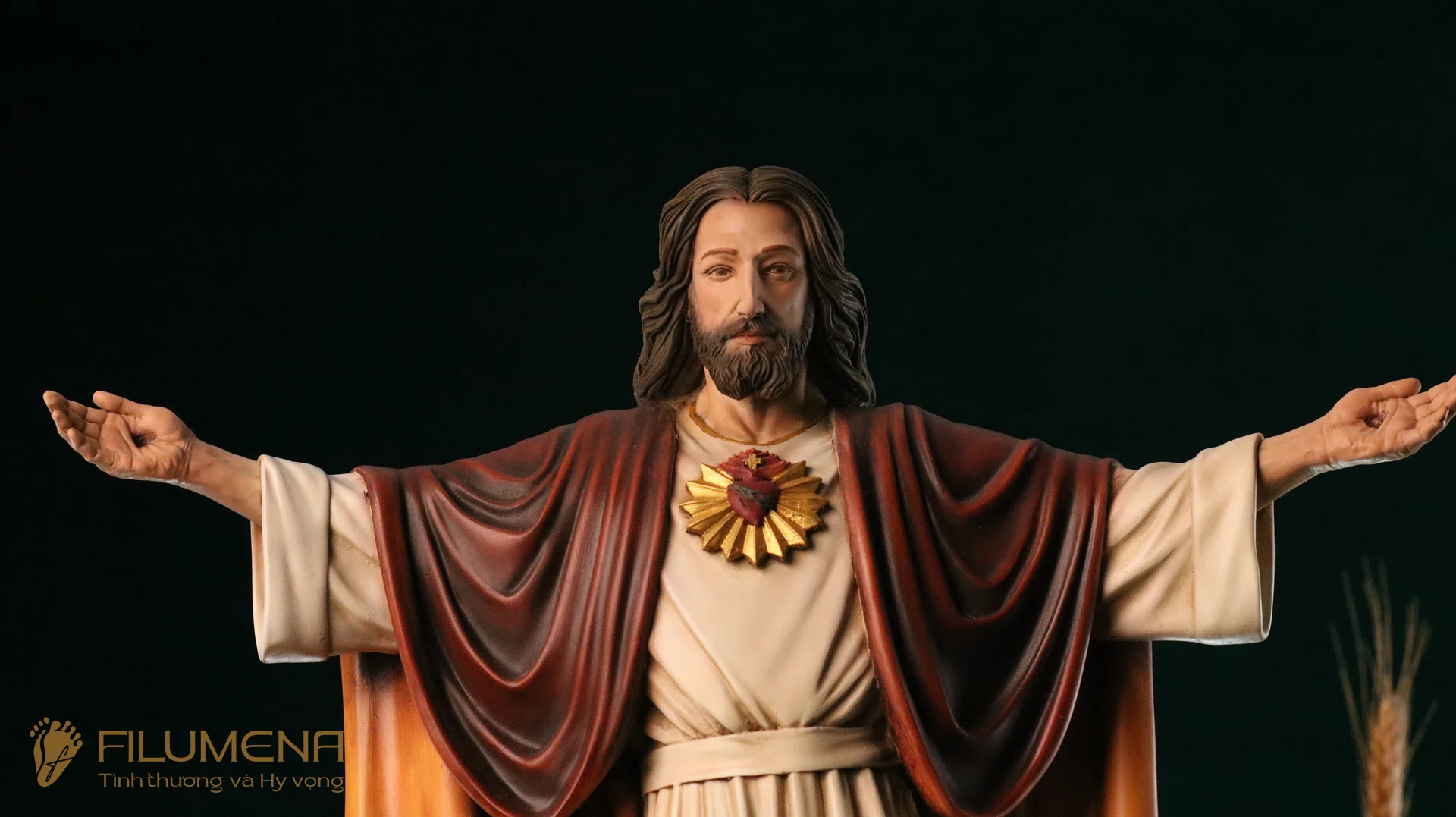 Tượng bằng chất liệu bột đá, cao 50 cm, được vẽ màu thủ công. Có đủ các kích thước 20 cm, 30 cm, 40cm, 50cm. Đây là tác phẩm thuộc bộ 3 tượng cho bàn thờ Công giáo của Filumena.