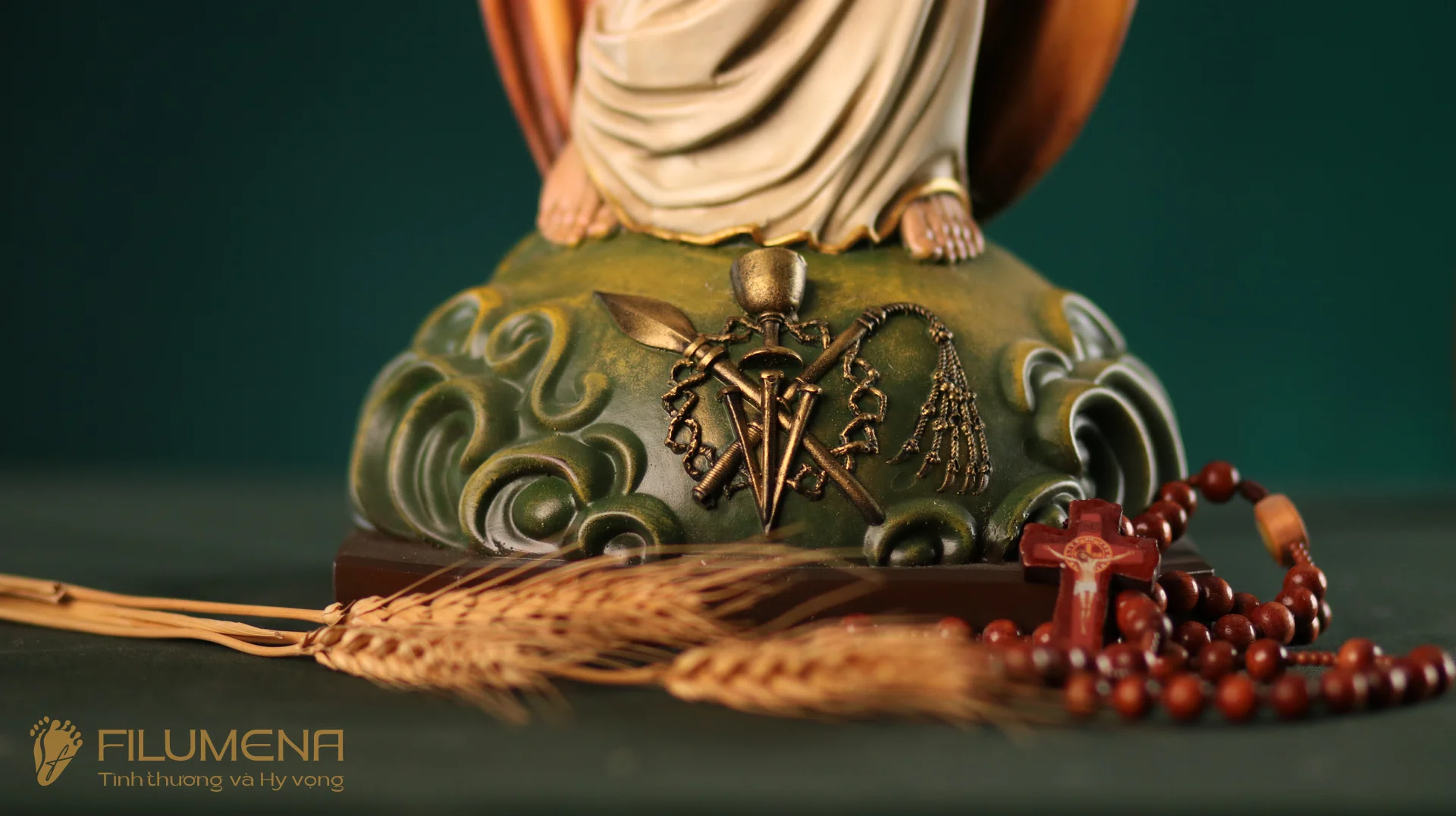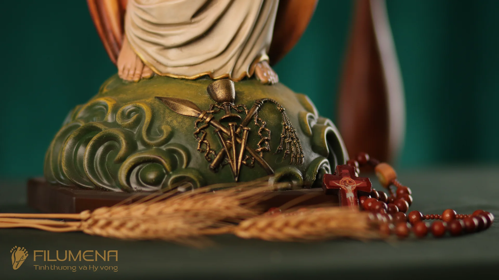 Tượng bằng chất liệu bột đá, cao 50 cm, được vẽ màu thủ công. Đây là tác phẩm thuộc bộ 3 tượng cho bàn thờ Công giáo của Filumena.