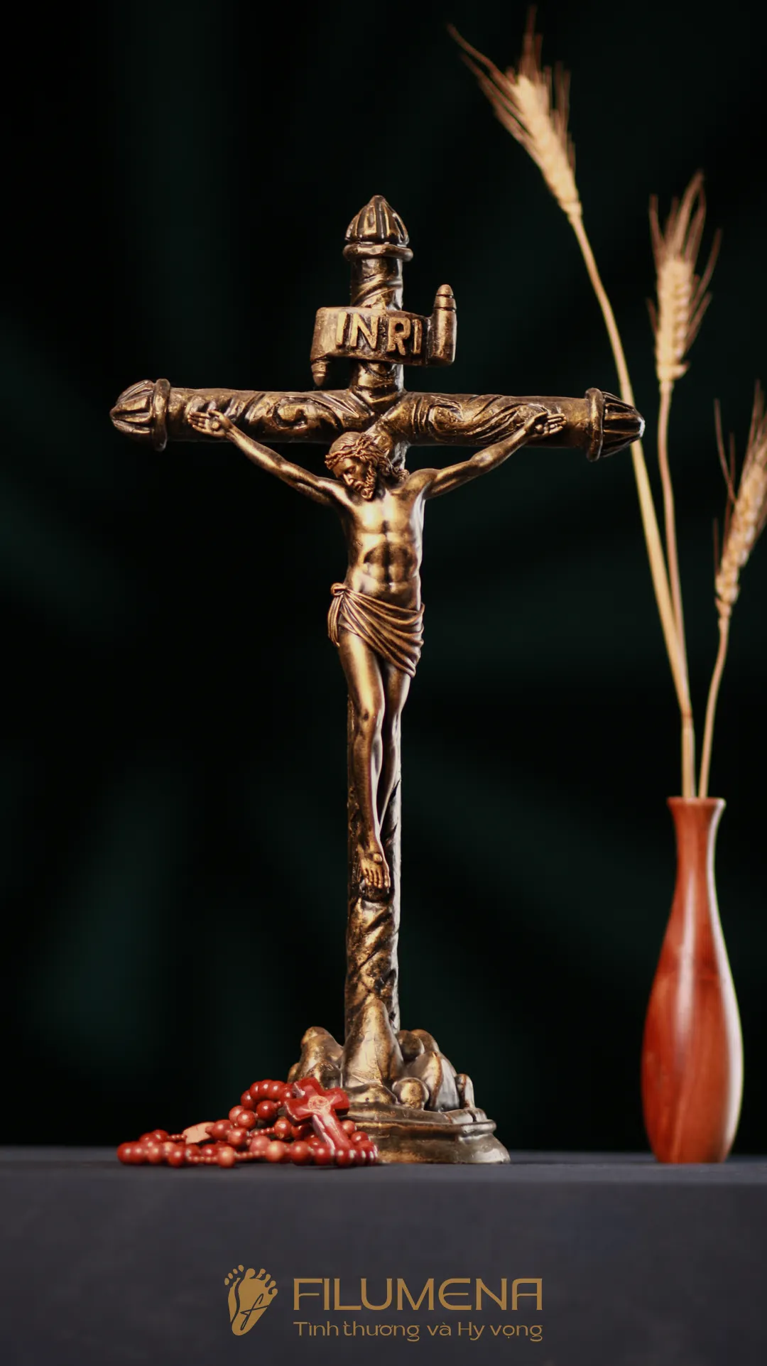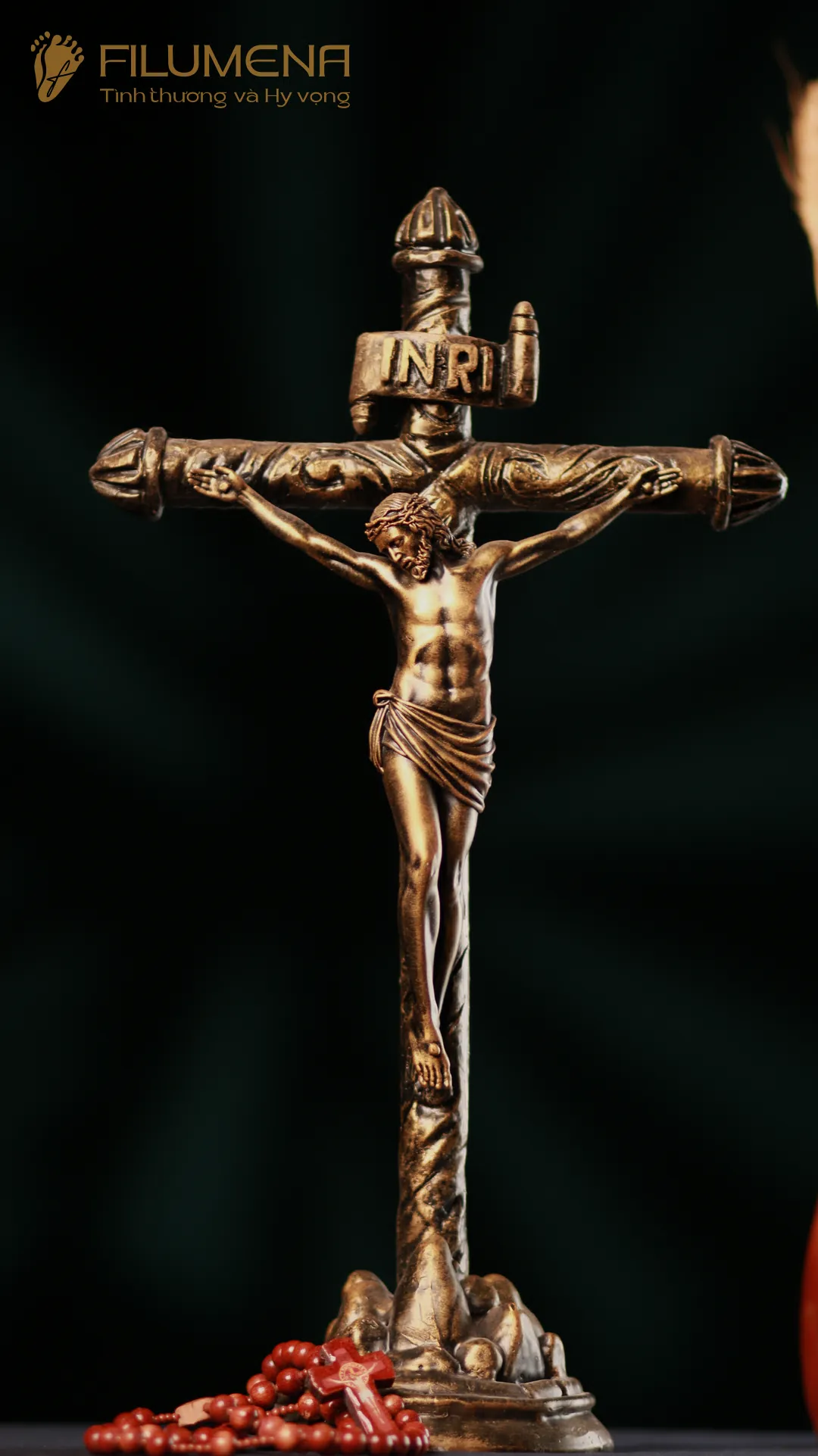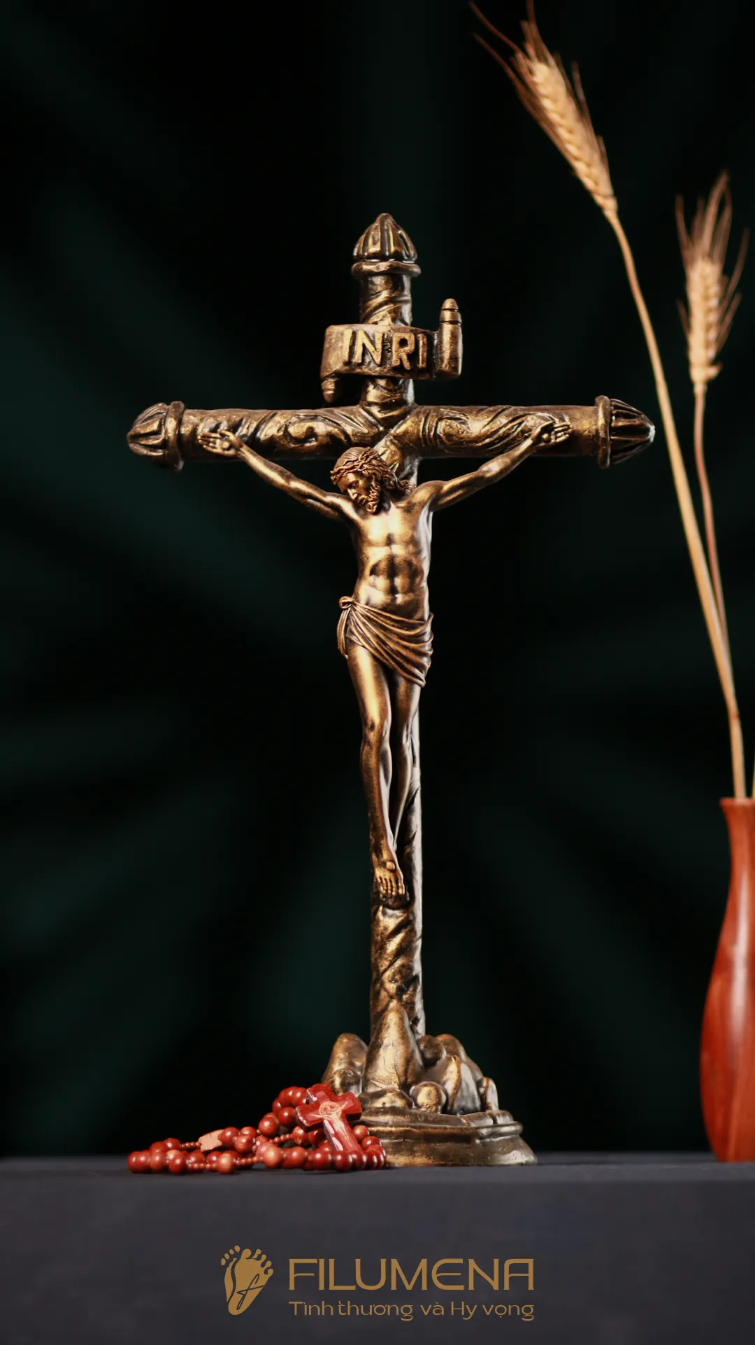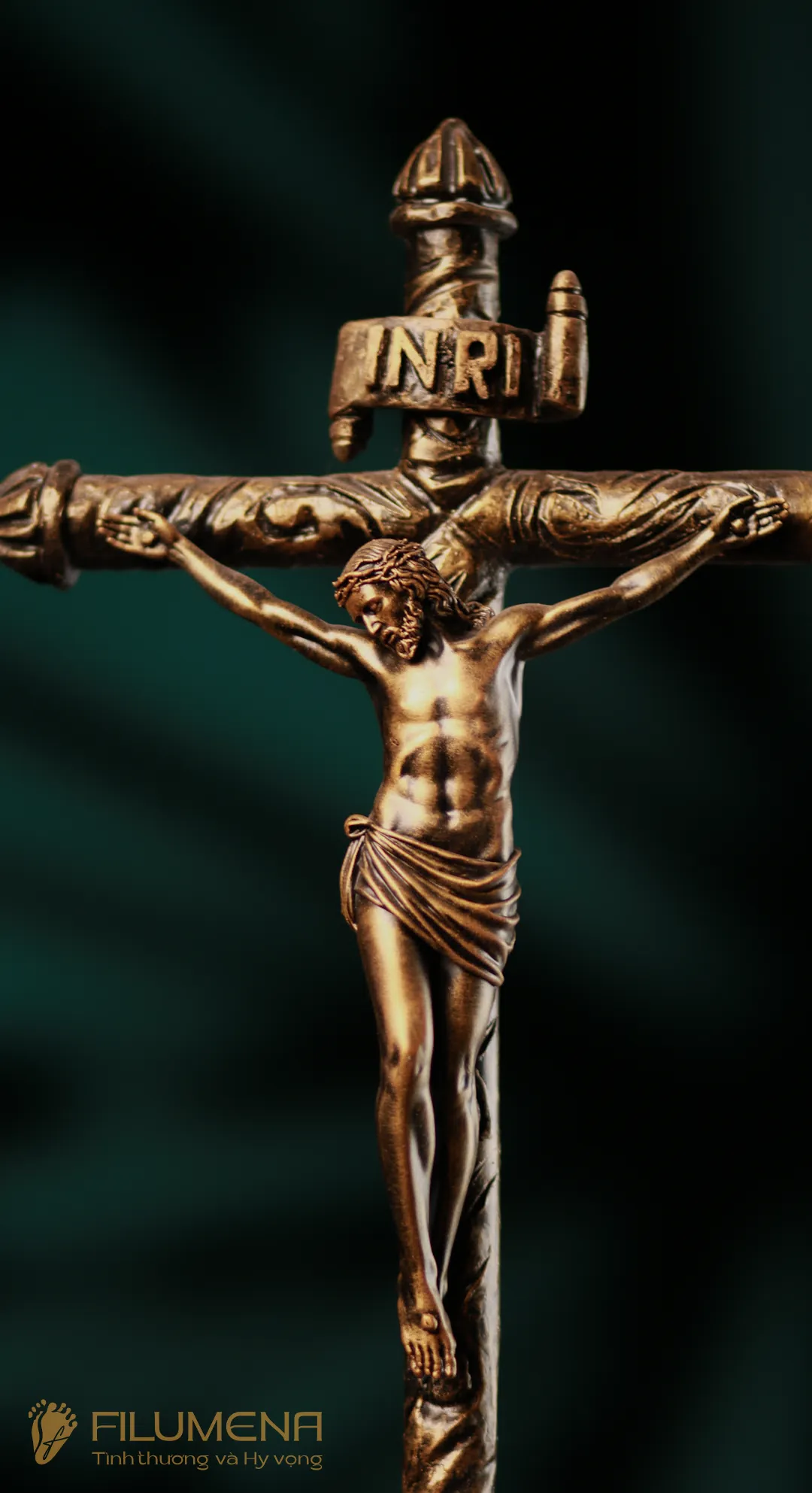 Tượng Chuộc Tội để bàn màu đồng được chế tác tỉ mỉ, thể hiện hình ảnh Chúa Giêsu chịu đóng đinh trên Thánh Giá – biểu tượng tối cao của tình yêu cứu độ. Tượng Chúa cao 20 cm, được đặt trên Thánh giá cao 41 cm, rộng 22 cm, phù hợp để trưng bày trên bàn thờ gia đình, góc cầu nguyện cá nhân hoặc không gian thánh thiêng tại nhà. Tượng Chúa cao 30cm, được đặt trên Thánh giá cao 61cm, rộng 34 cm