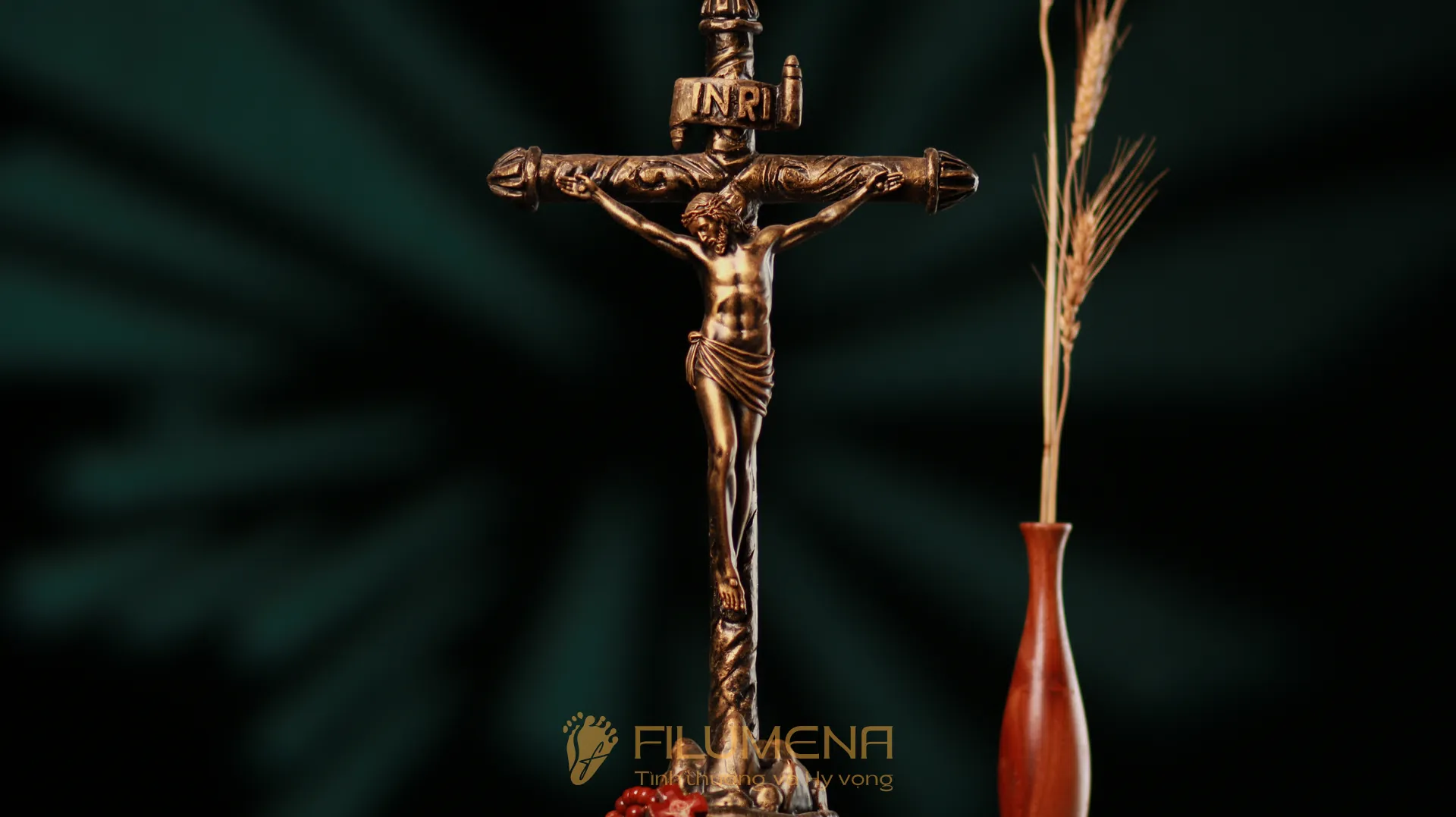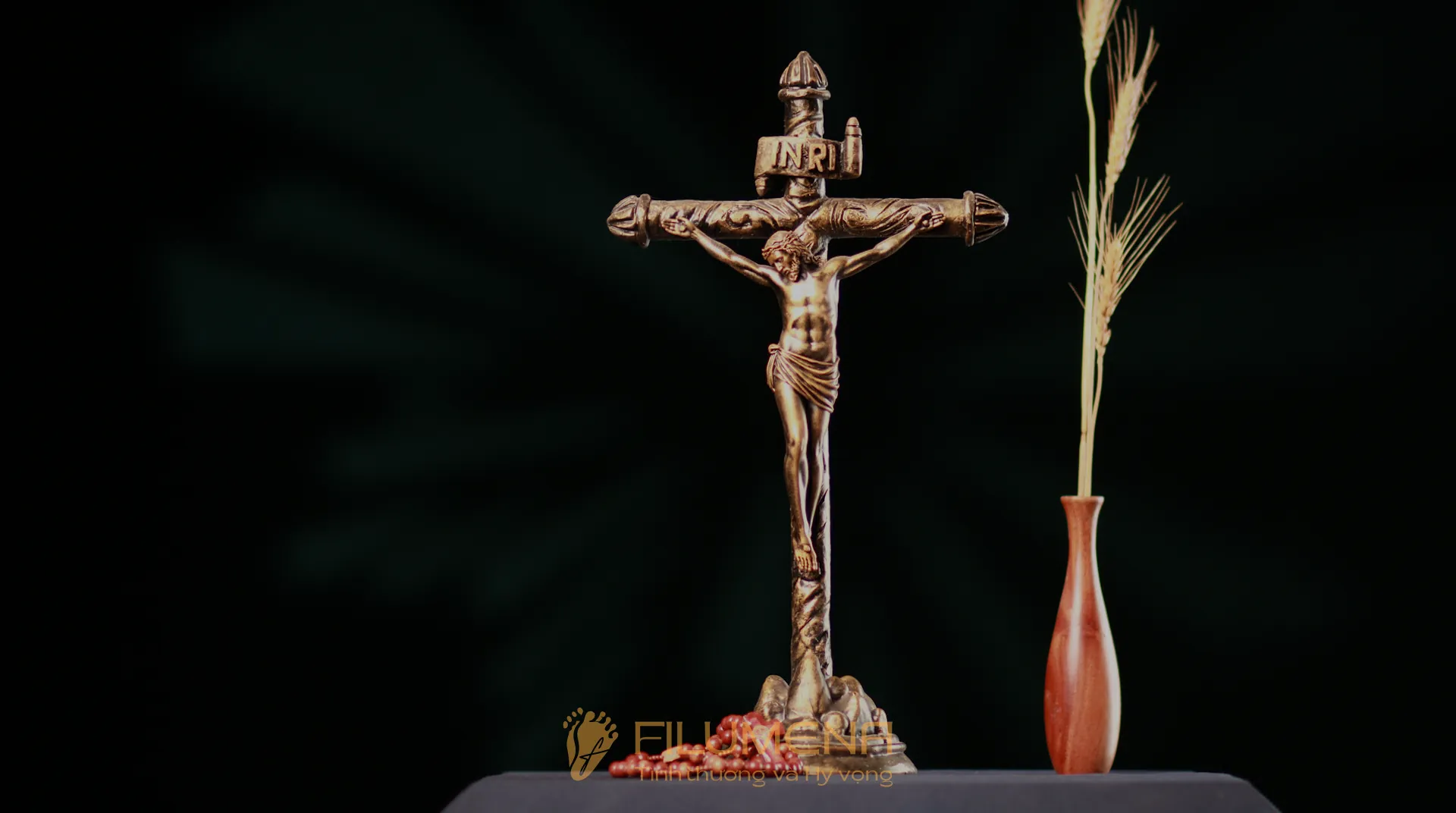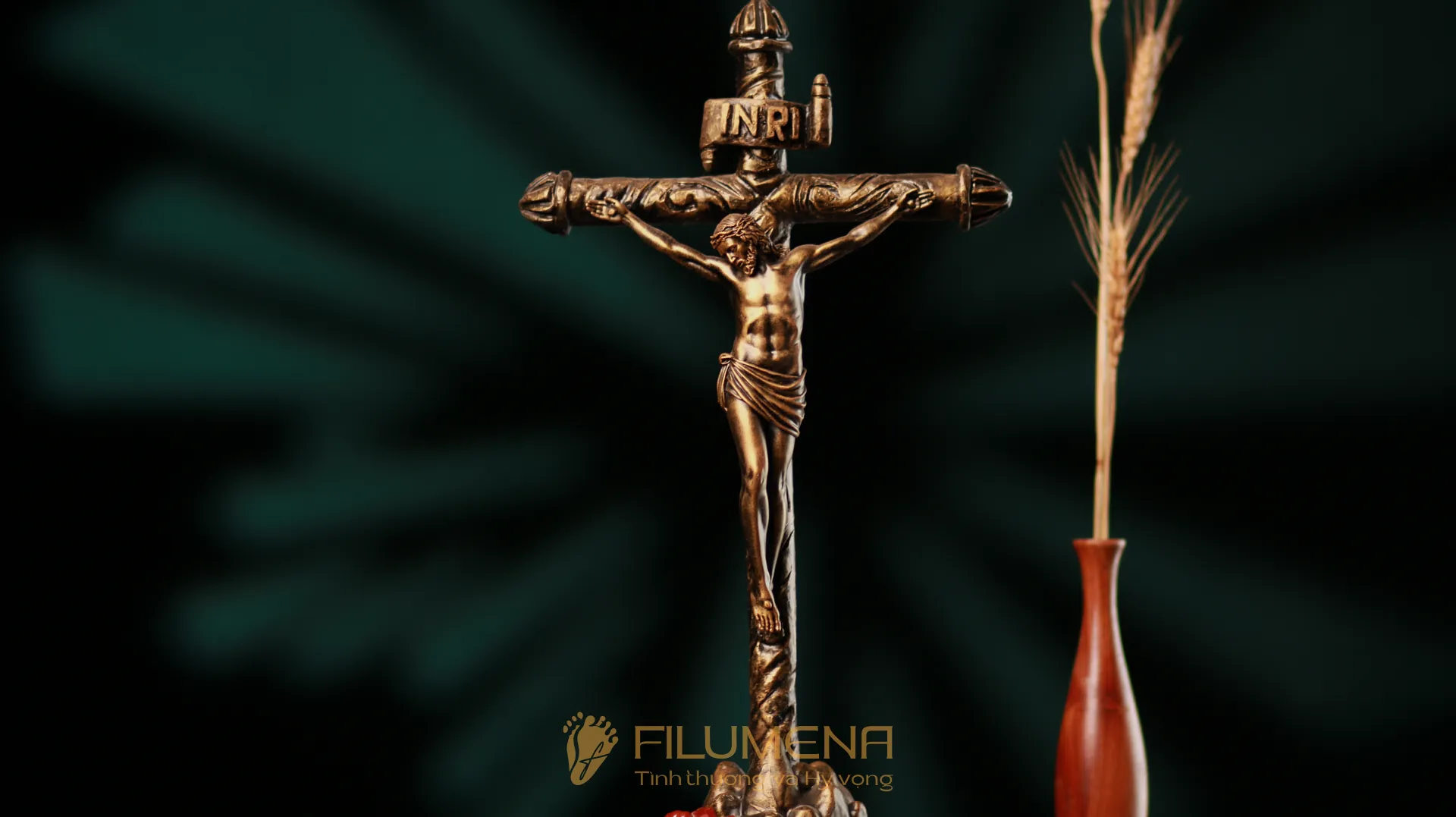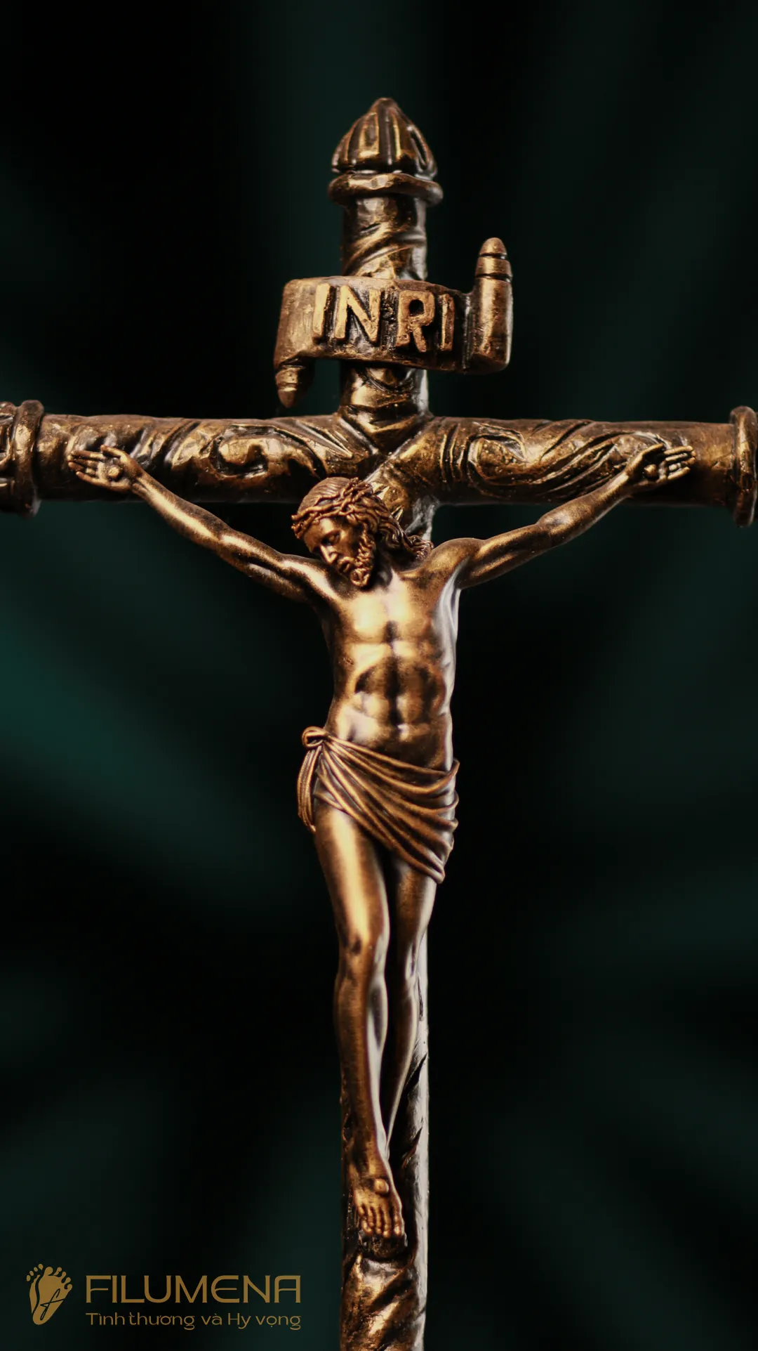 Tượng Chuộc Tội để bàn màu đồng được chế tác tỉ mỉ, thể hiện hình ảnh Chúa Giêsu chịu đóng đinh trên Thánh Giá – biểu tượng tối cao của tình yêu cứu độ. Tượng Chúa cao 20 cm, được đặt trên Thánh giá cao 41 cm, rộng 22 cm, phù hợp để trưng bày trên bàn thờ gia đình, góc cầu nguyện cá nhân hoặc không gian thánh thiêng tại nhà. Tượng Chúa cao 30cm, được đặt trên Thánh giá cao 61cm, rộng 34 cm