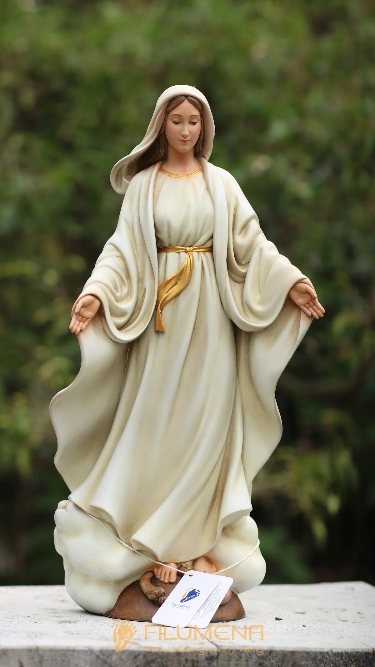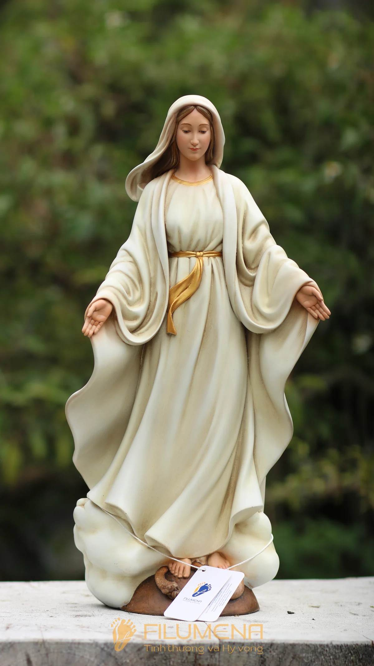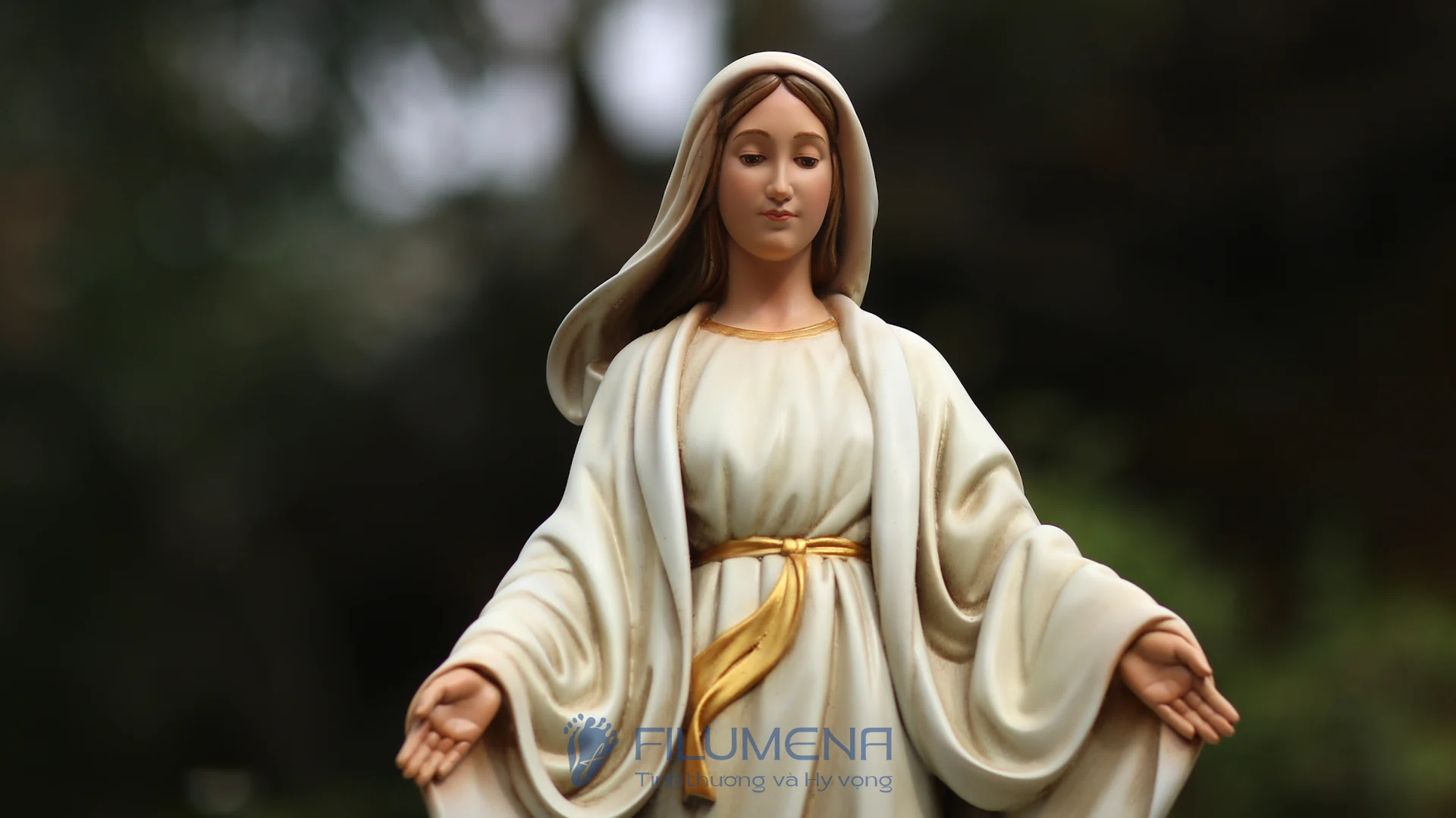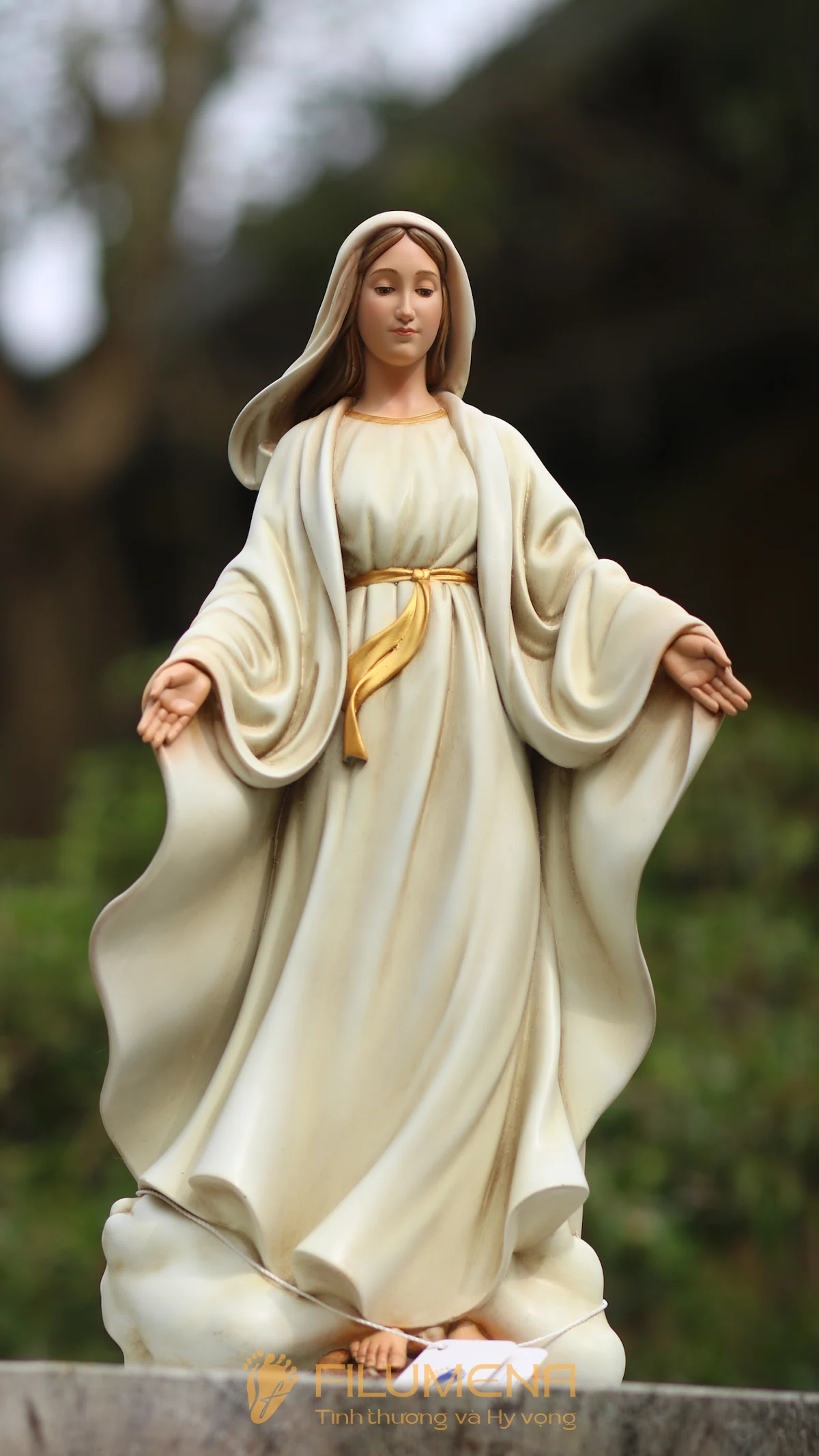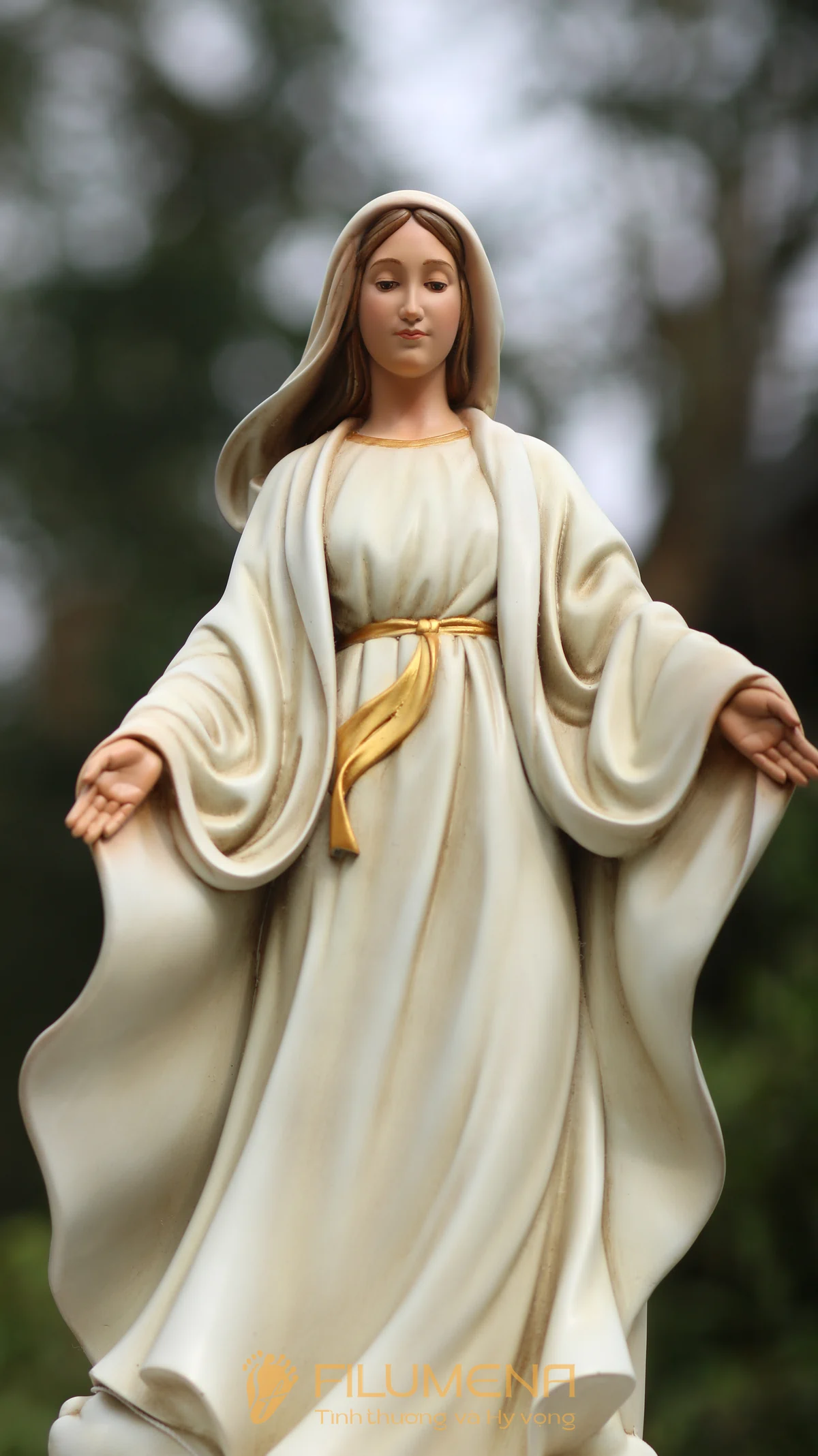 Tượng Đức Mẹ Ban Ơn do Filumena sáng tác, Đức Mẹ trong áo trắng ngà dịu nhẹ, dang tay ban ơn lành cho con cái. Nhiều kích thước từ 15–80 cm, phù hợp cho bàn thờ Chúa phòng khách, bàn thờ Công giáo mini và xe ô tô. Hình tượng được lấy cảm hứng từ Mề-đay Huyền Nhiệm, mang lại cảm giác bình an, tín thác cho những ai yêu mến Đức Mẹ.