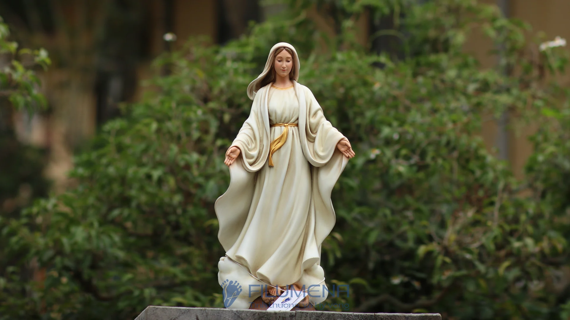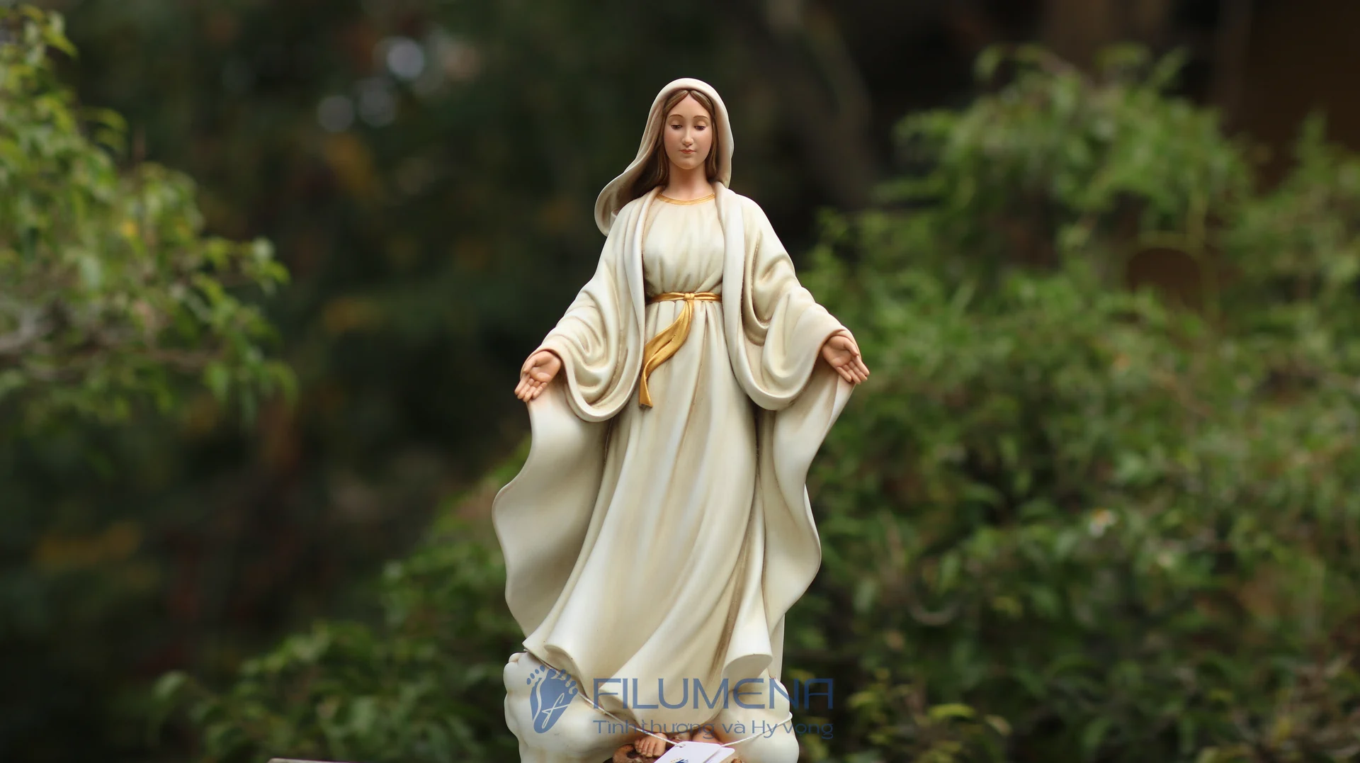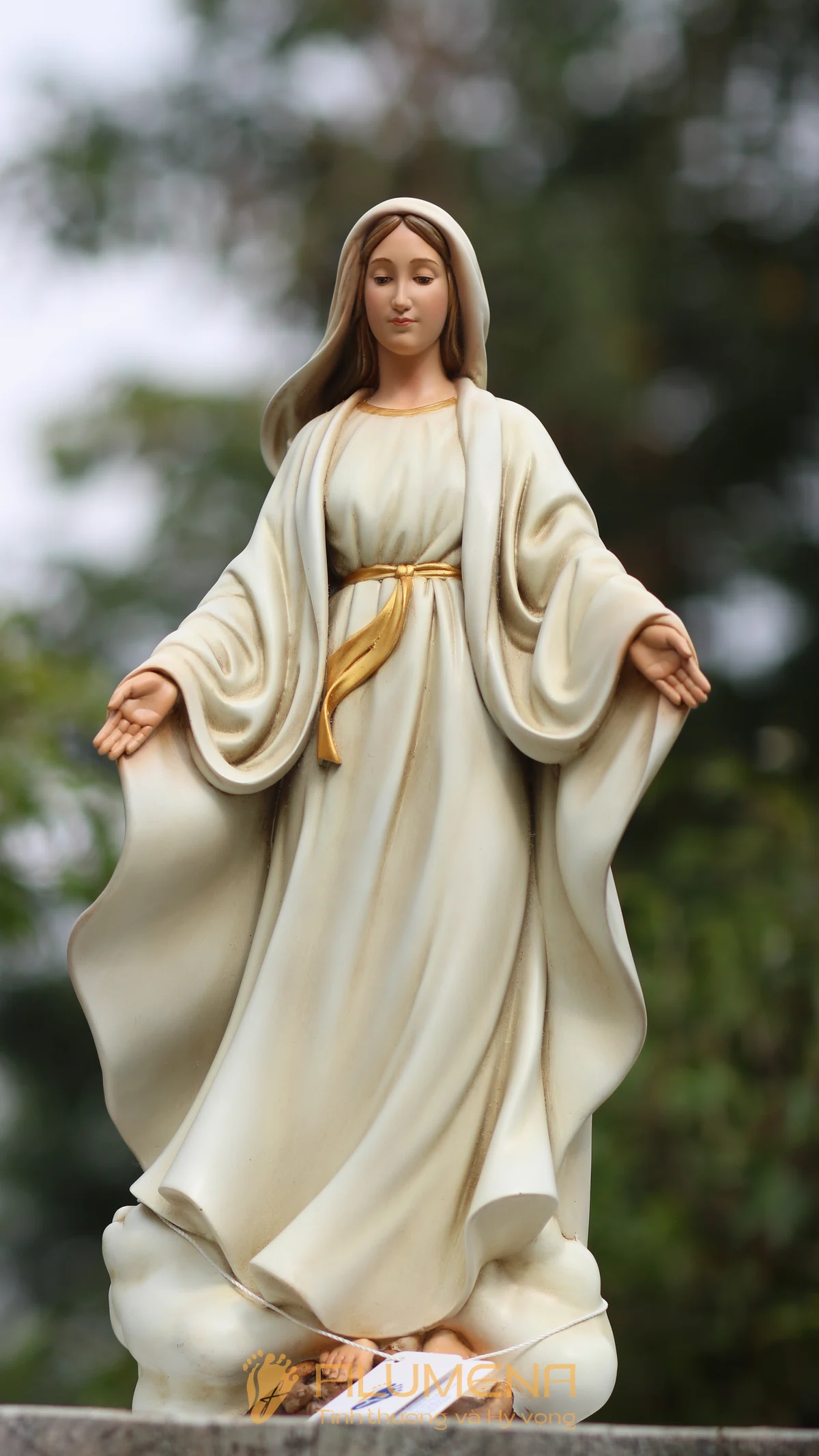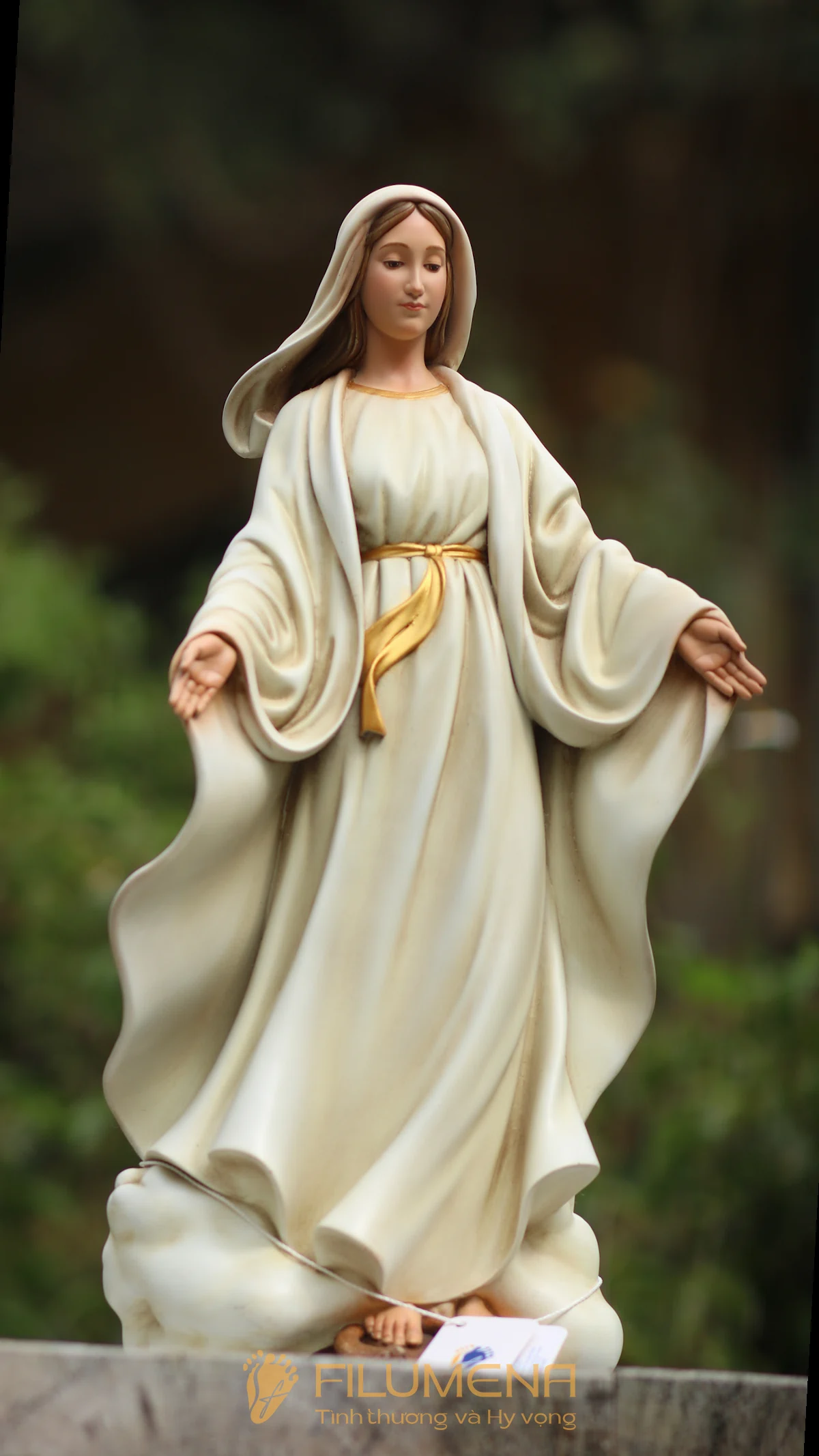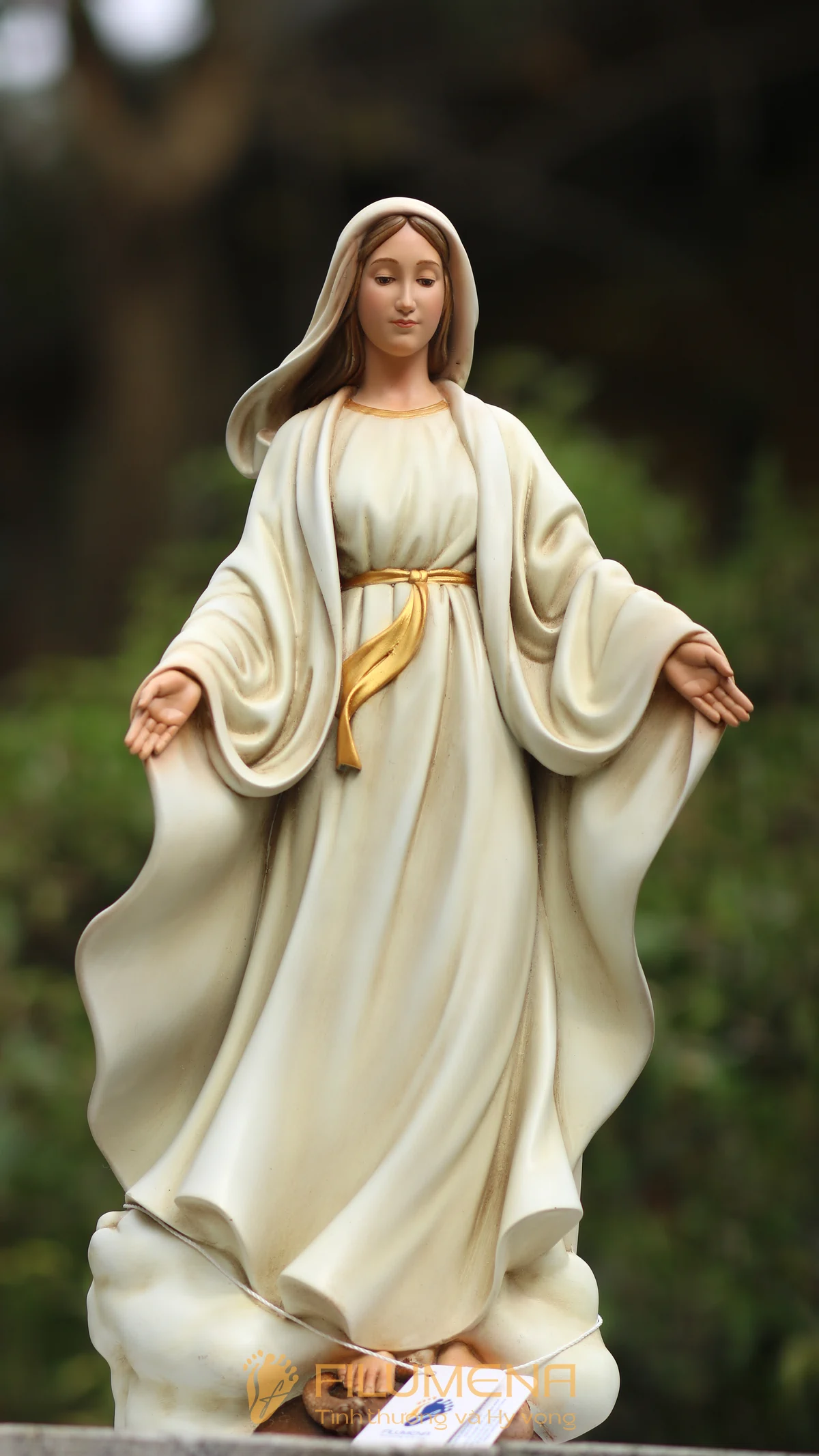 Tượng Đức Mẹ Ban Ơn do Filumena sáng tác, Đức Mẹ trong áo trắng ngà dịu nhẹ, dang tay ban ơn lành cho con cái. Nhiều kích thước từ 15–80 cm, phù hợp cho bàn thờ Chúa phòng khách, bàn thờ Công giáo mini và xe ô tô. Hình tượng được lấy cảm hứng từ Mề-đay Huyền Nhiệm, mang lại cảm giác bình an, tín thác cho những ai yêu mến Đức Mẹ.