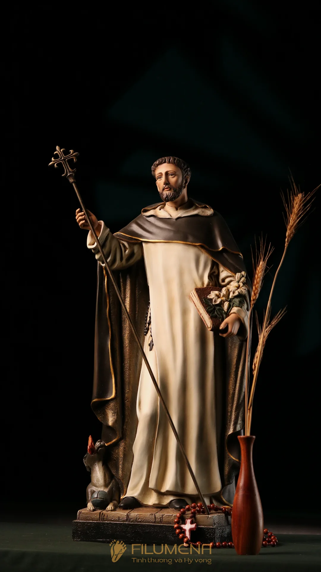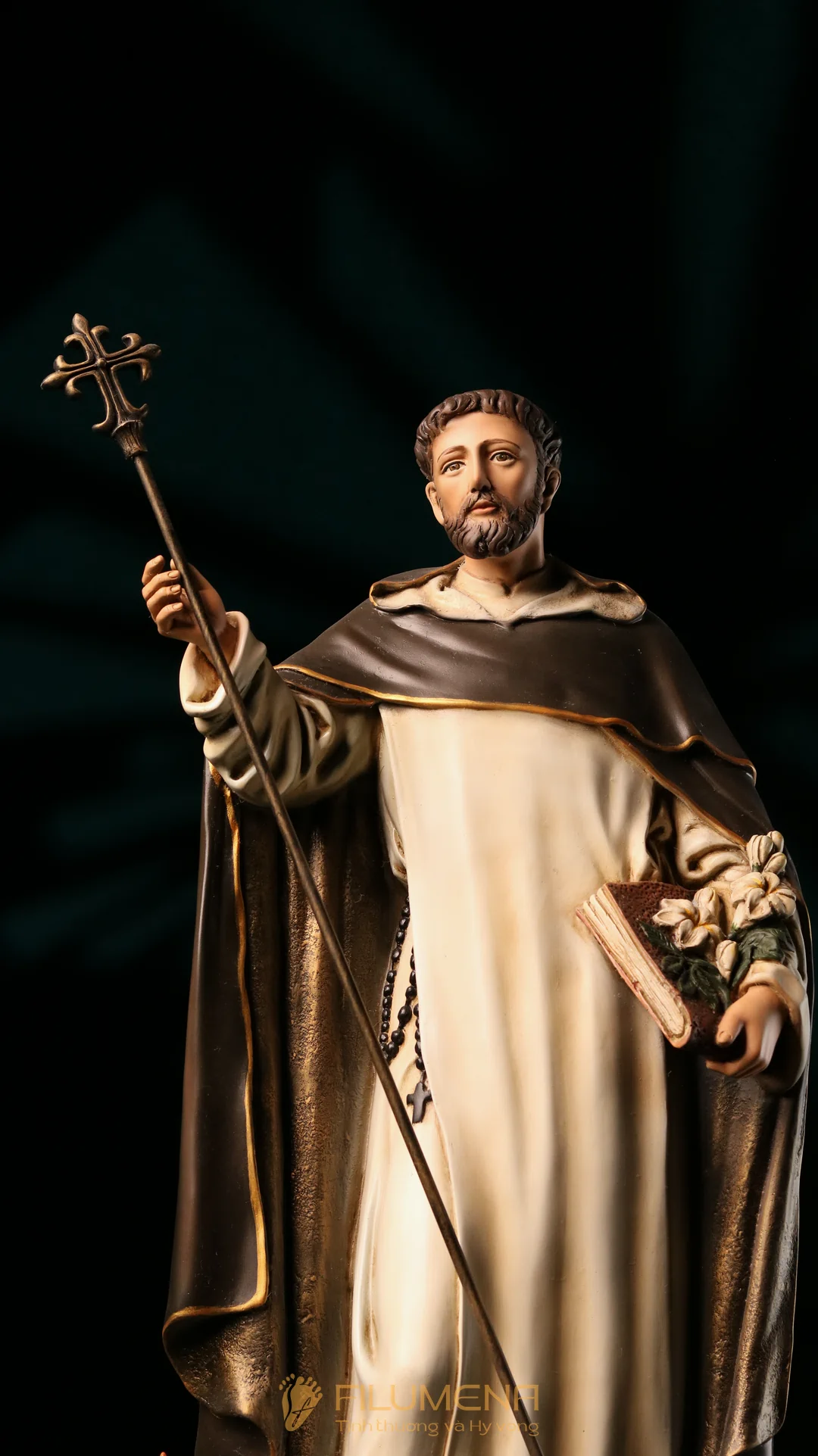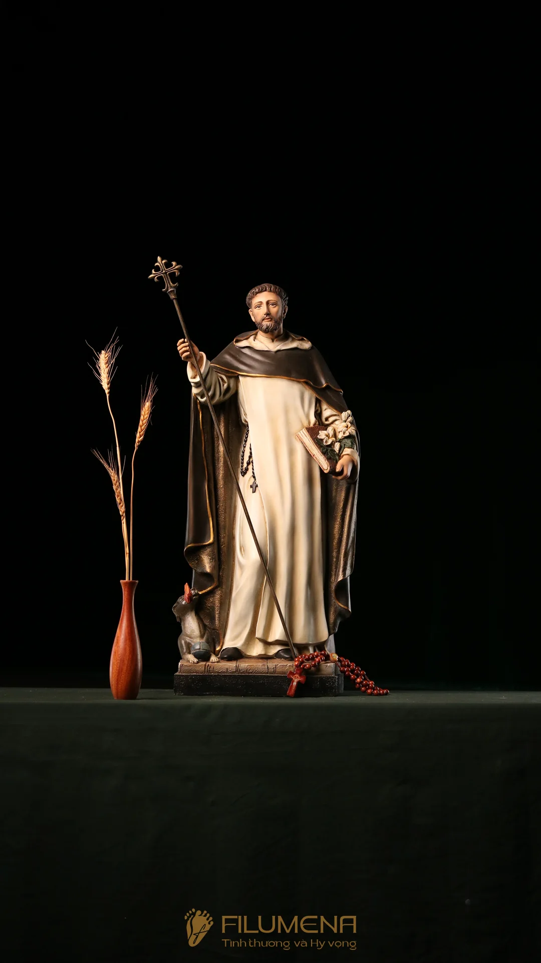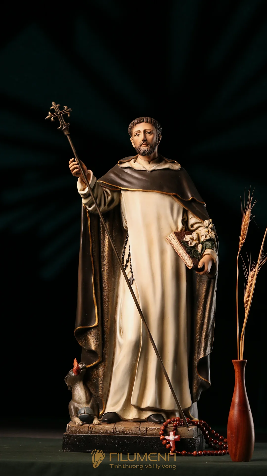 Thánh nhân khoác áo dòng Đa Minh truyền thống, tay cầm gậy giảng thuyết và sách Kinh Thánh – biểu tượng cho đời sống rao giảng Lời Chúa. Đóa huệ trắng và chuỗi Mân Côi gợi lên đời sống khiết tịnh và lòng sùng kính Đức Mẹ. Chú chó nhỏ dưới chân là hình ảnh gắn liền với truyền thuyết về sứ mạng thắp lửa đức tin. Mẫu tượng phù hợp trưng bày tại bàn thờ gia đình hoặc nơi cầu nguyện riêng.