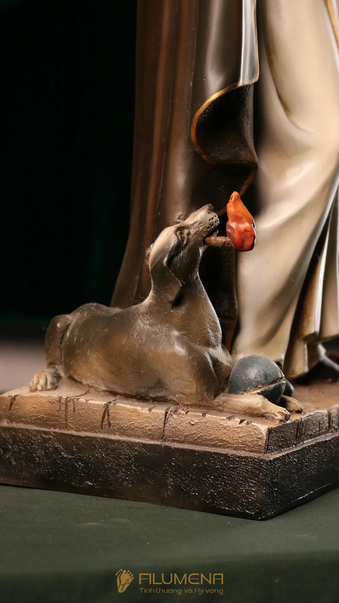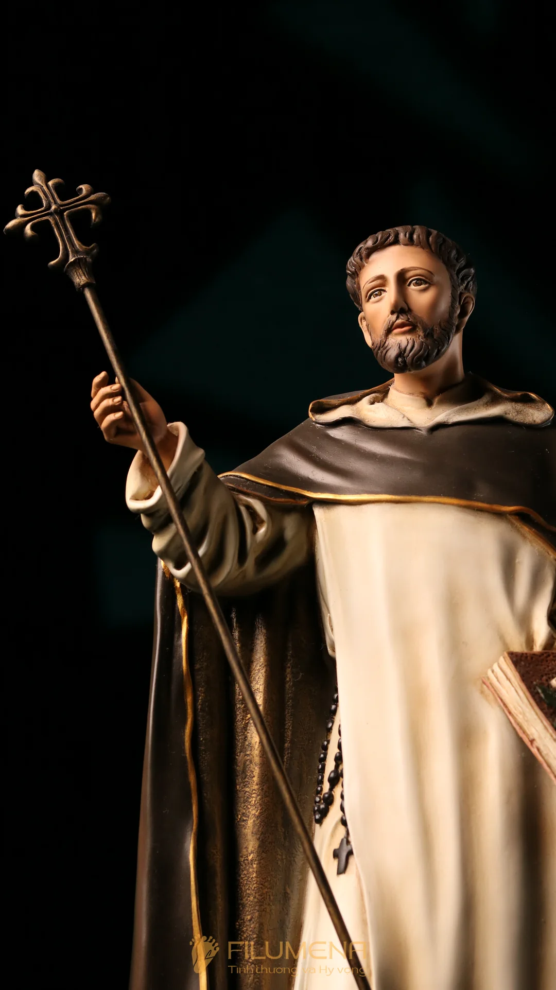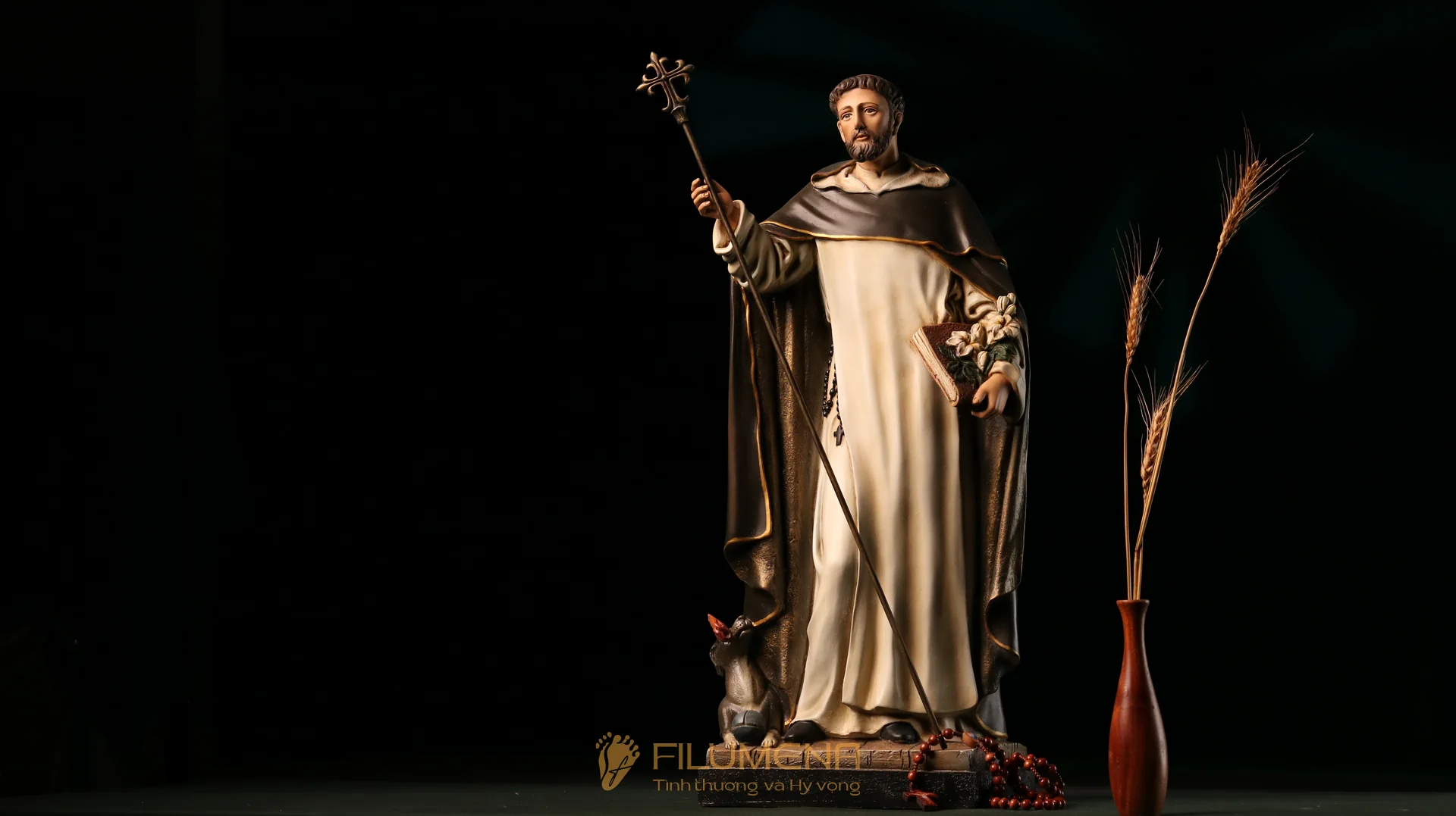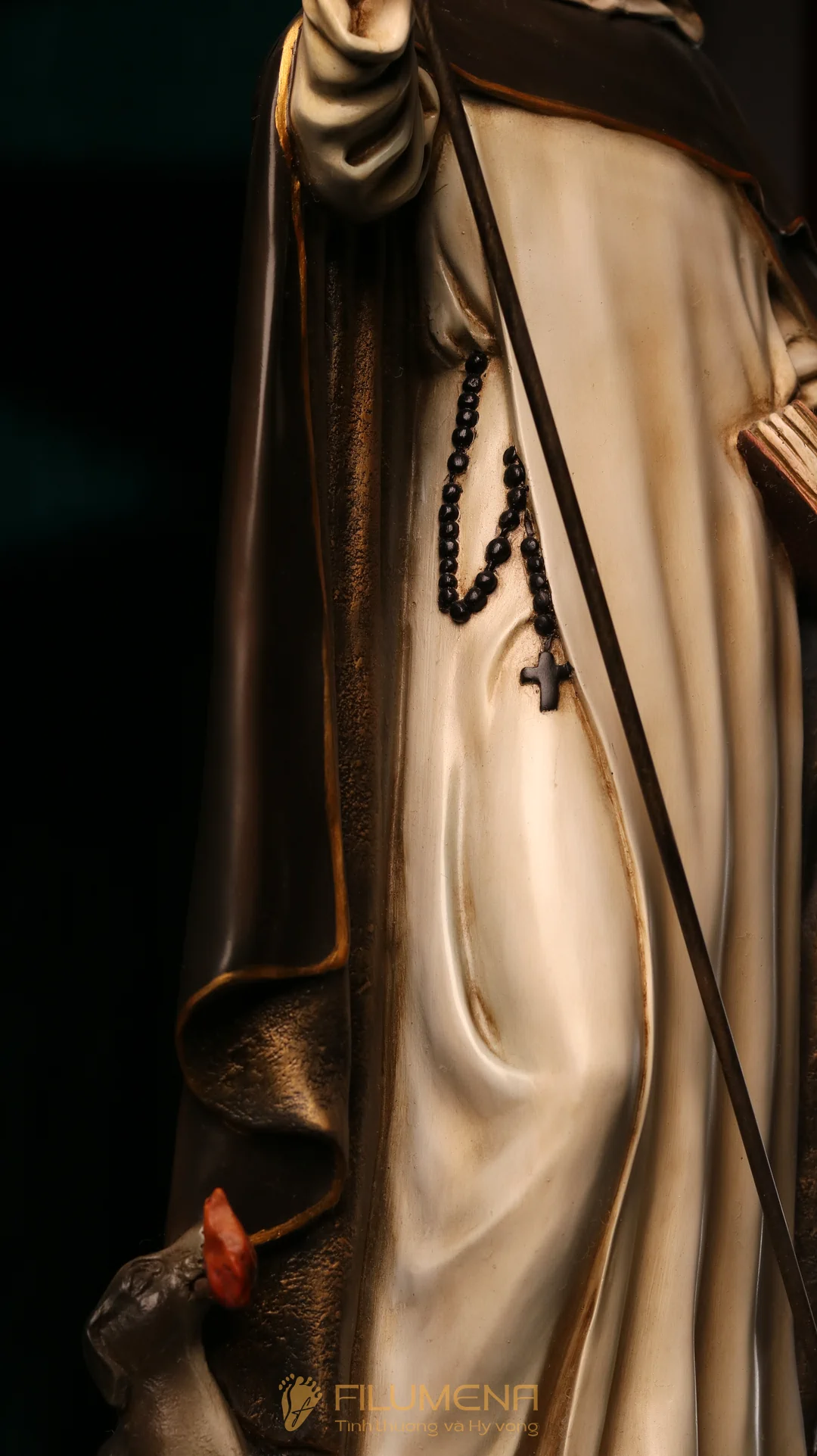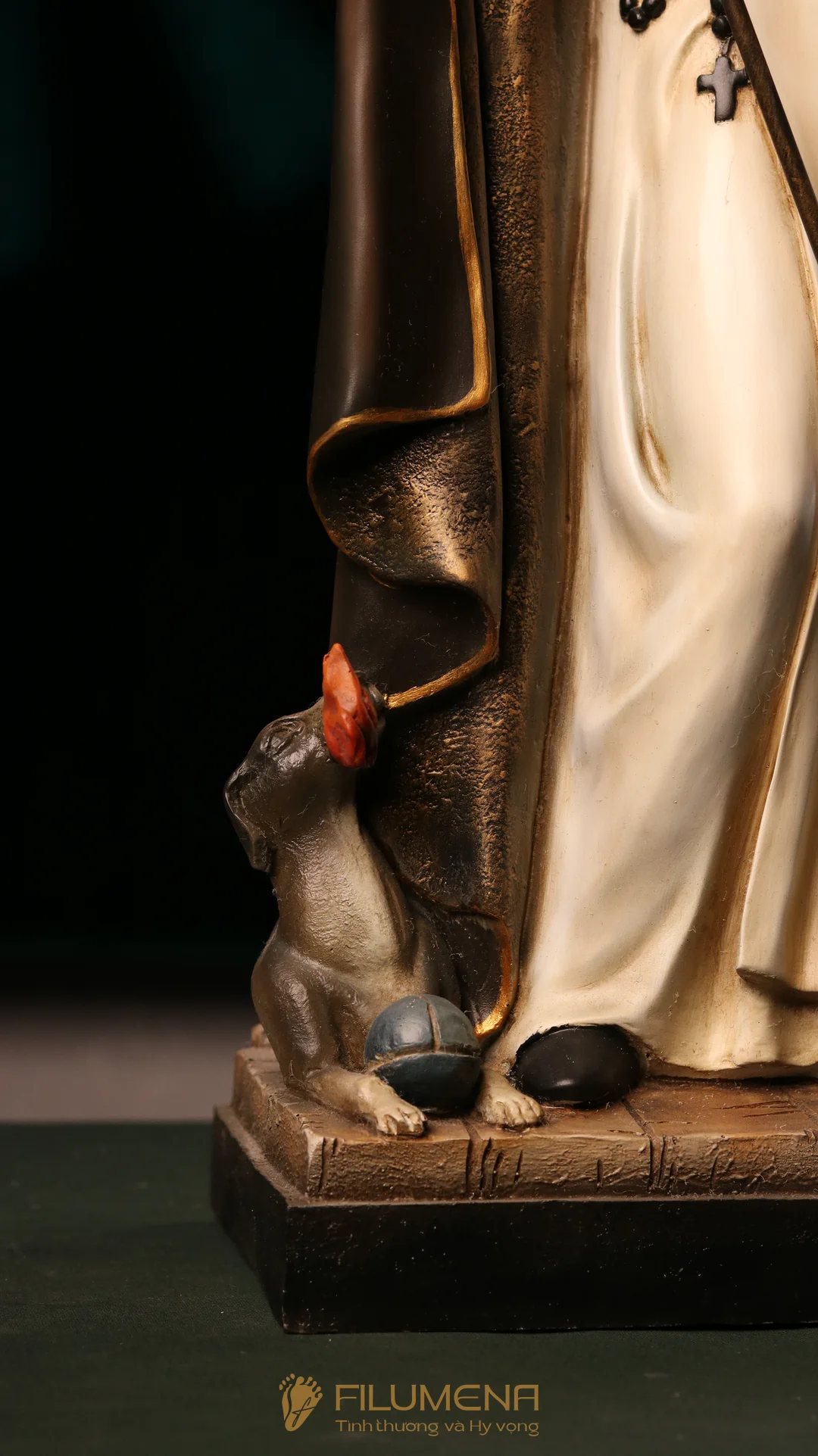 Thánh nhân khoác áo dòng Đa Minh truyền thống, tay cầm gậy giảng thuyết và sách Kinh Thánh – biểu tượng cho đời sống rao giảng Lời Chúa. Đóa huệ trắng và chuỗi Mân Côi gợi lên đời sống khiết tịnh và lòng sùng kính Đức Mẹ. Chú chó nhỏ dưới chân là hình ảnh gắn liền với truyền thuyết về sứ mạng thắp lửa đức tin. Mẫu tượng phù hợp trưng bày tại bàn thờ gia đình hoặc nơi cầu nguyện riêng.