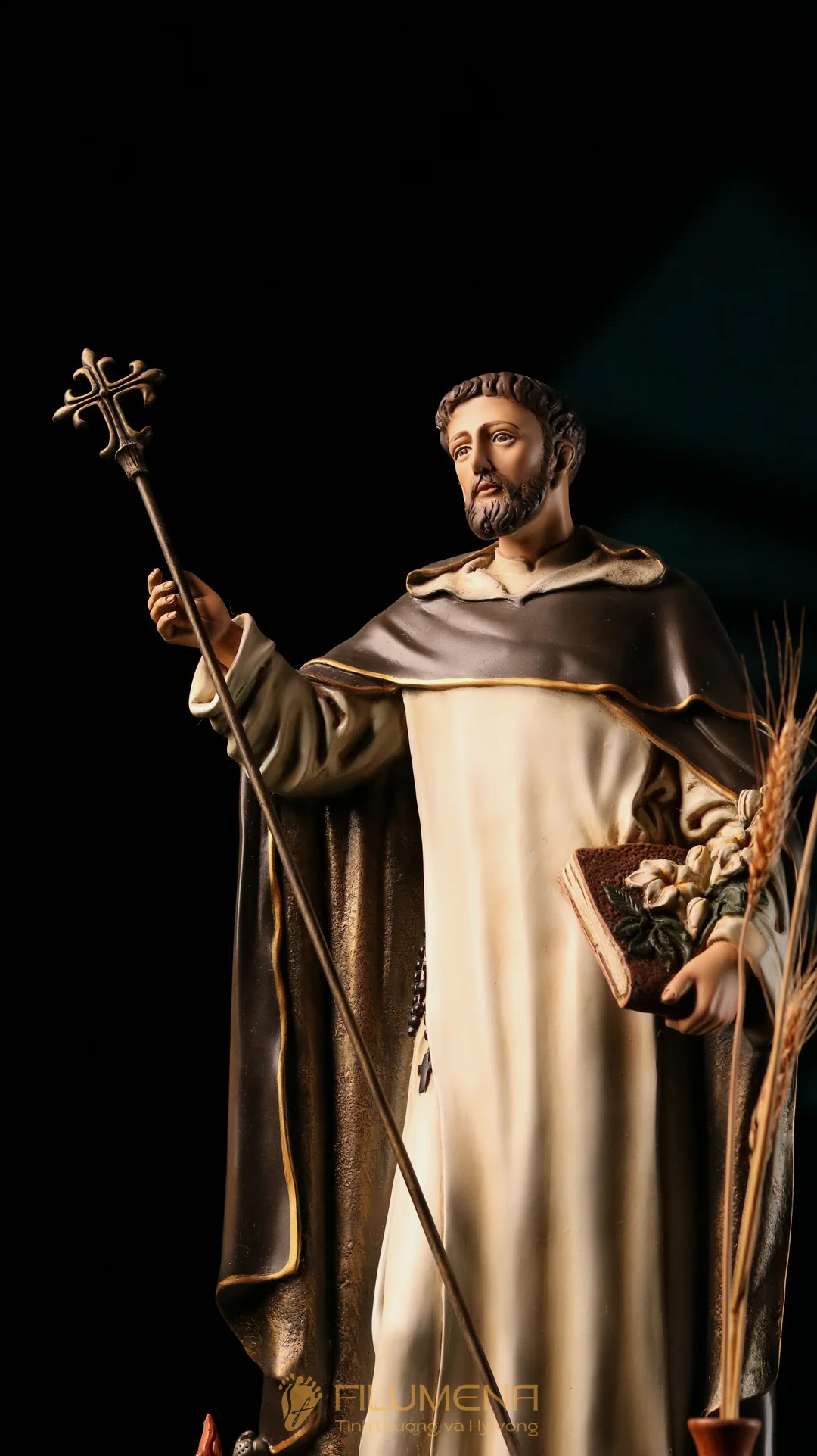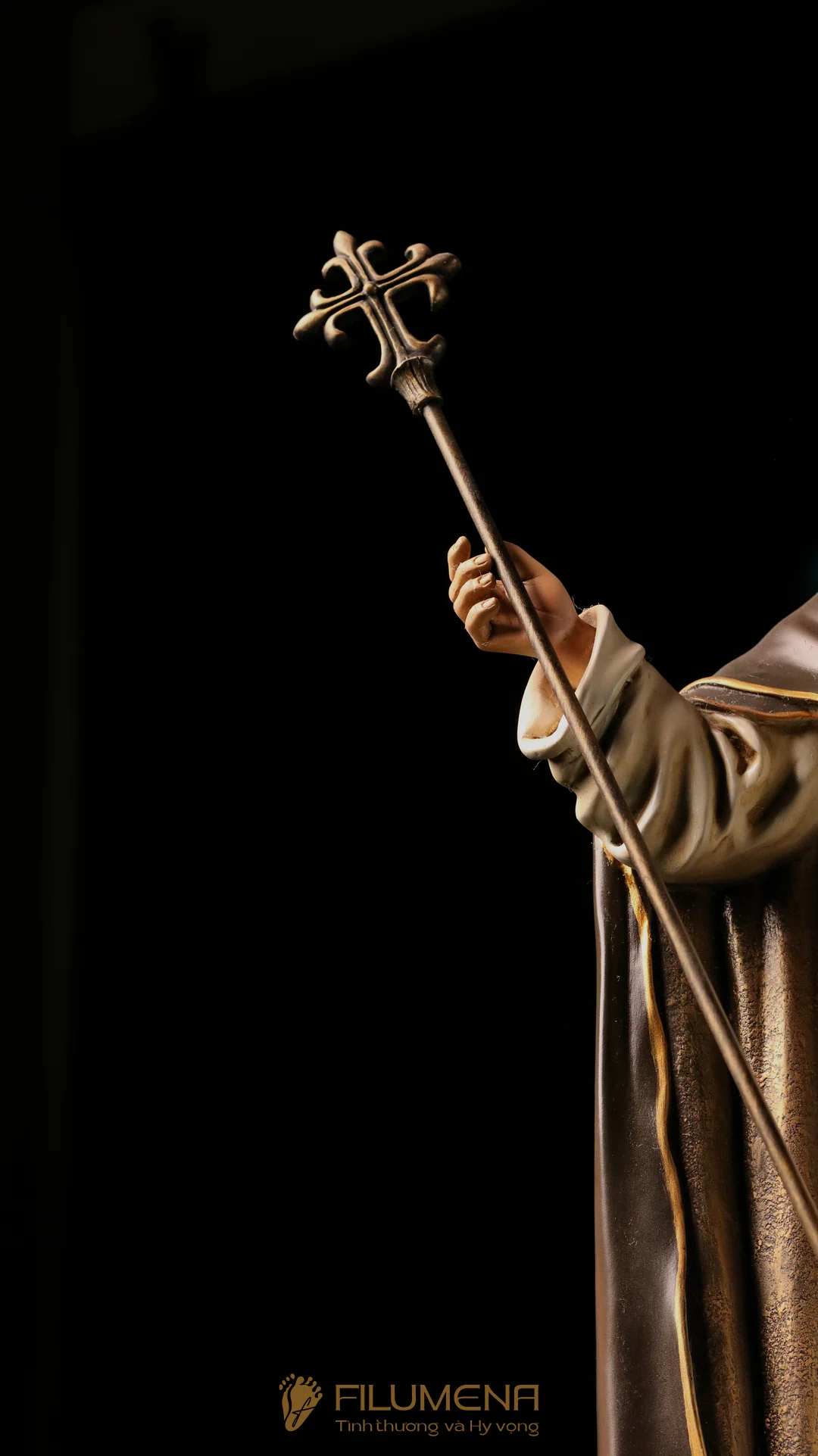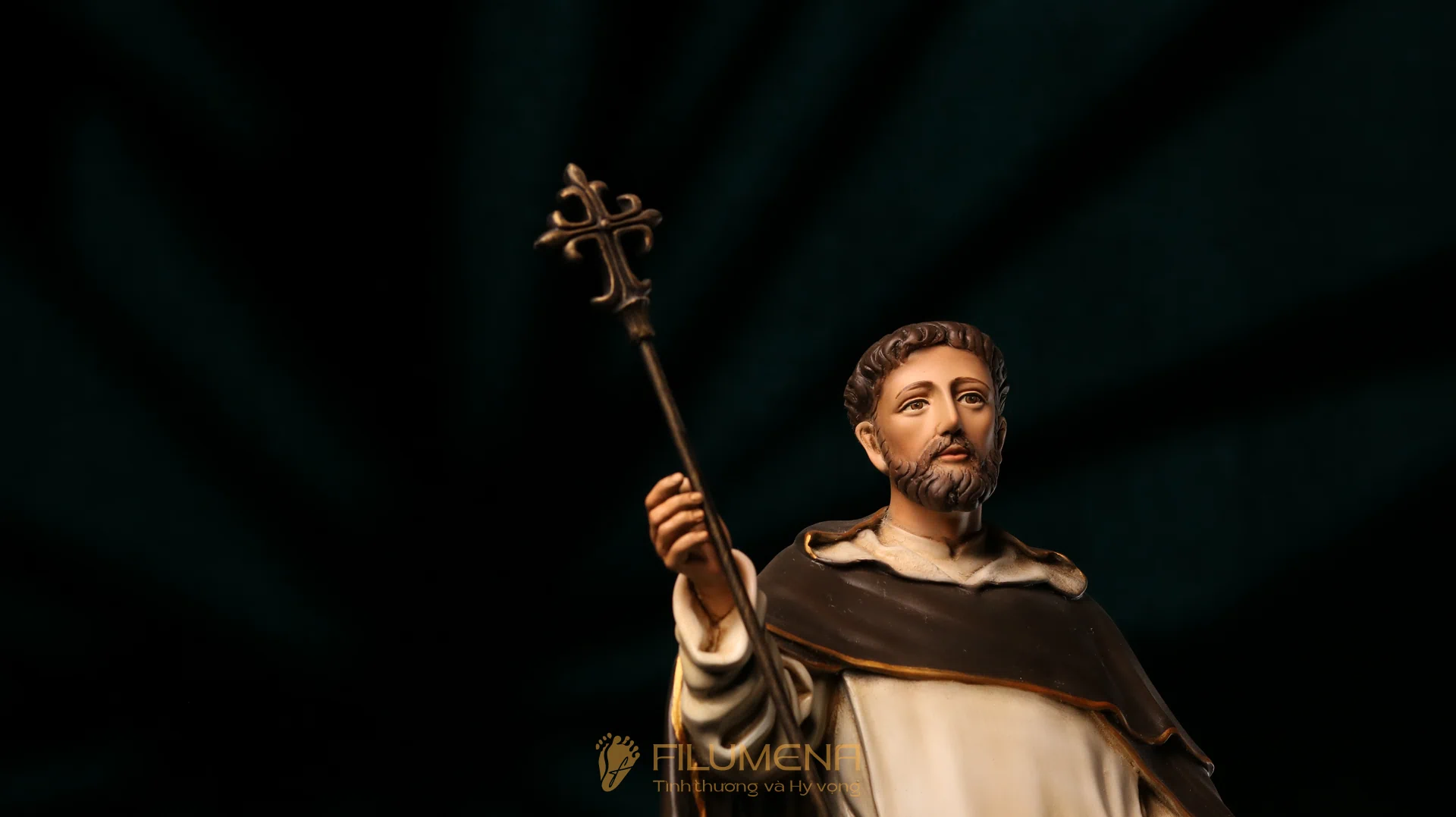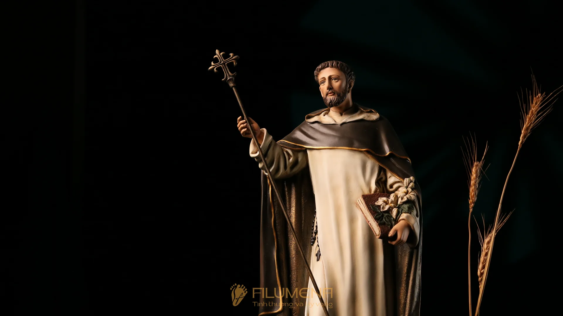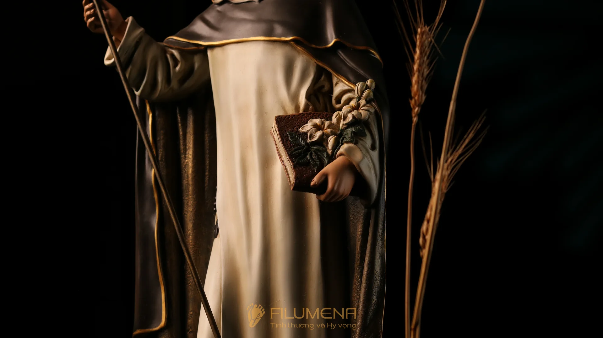 Tượng Thánh Đa Minh cao 60 cm của Filumena được sáng tác với tỉ lệ hài hòa, thần thái hiền từ và ánh nhìn sâu lắng.